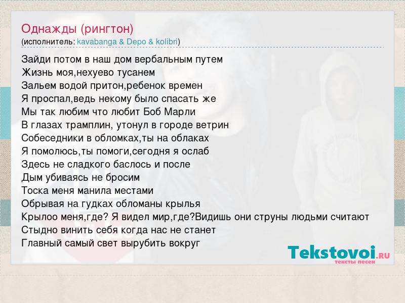 Зайди потом в наш дом вербальным путем Жизнь моя,нехуево тусанем Зальем водой притон,ребенок времен Я проспал,ведь некому было спасать же Мы так любим что любит Боб Марли В глазах трамплин, утонул в городе ветрин Собеседники в обломках,ты на облаках Я помолюсь,ты помоги,сегодня я ослаб Здесь не сладкого баслось и после Дым убиваясь не бросим Тоска меня манила местами Обрывая на гудках обломаны крылья Крылоо меня,где? Я видел мир,где?Видишь они струны людьми считают Стыдно винить себя когда нас не станет Главный самый свет вырубить вокруг