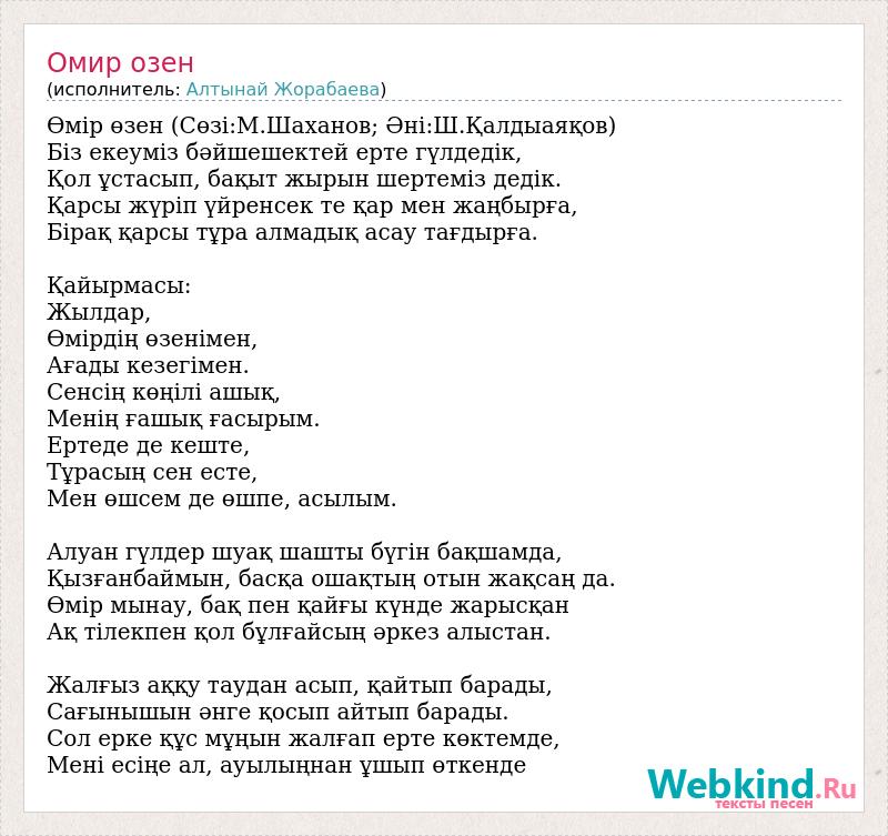 Өмір өзен (Сөзі:М.Шаханов; Әні:Ш.Қалдыаяқов) Біз екеуміз бәйшешектей ерте гүлдедік, Қол ұстасып, бақыт жырын шертеміз дедік. Қарсы жүріп үйренсек те қар мен жаңбырға, Бірақ қарсы тұра алмадық асау тағдырға. Қайырмасы: Жылдар, Өмірдің өзенімен, Ағады кезегімен. Сенсің көңілі ашық, Менің ғашық ғасырым. Ертеде де кеште, Тұрасың сен есте, Мен өшсем де өшпе, асылым. Алуан гүлдер шуақ шашты бүгін бақшамда, Қызғанбаймын, басқа ошақтың отын жақсаң да. Өмір мынау, бақ пен қайғы күнде жарысқан Ақ тілекпен қол бұлғайсың әркез алыстан. Жалғыз аққу таудан асып, қайтып барады, Сағынышын әнге қосып айтып барады. Сол ерке құс мұңын жалғап ерте көктемде, Мені есіңе ал, ауылыңнан ұшып өткенде