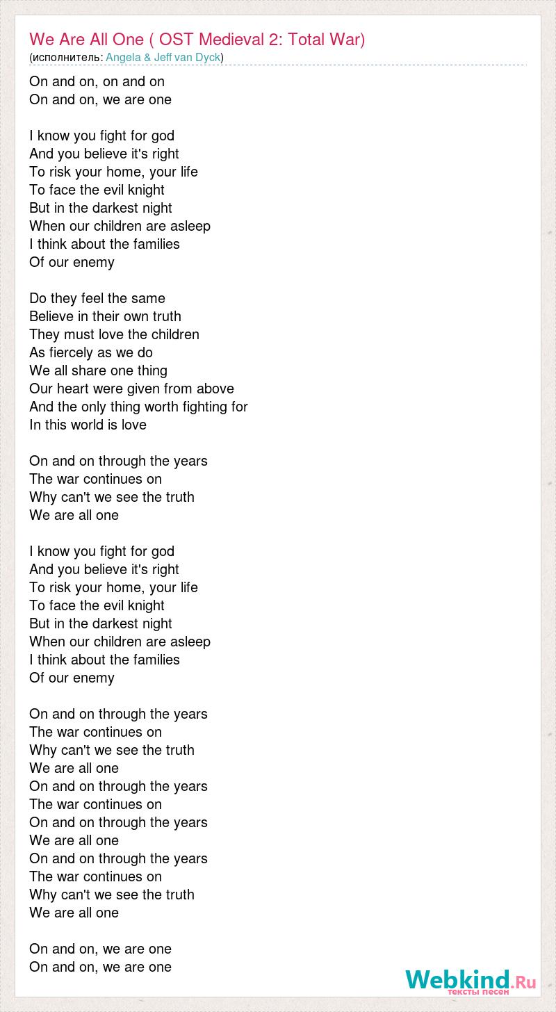 On and on, on and on On and on, we are one I know you fight for god And you believe it's right To risk your home, your life To face the evil knight But in the darkest night When our children are asleep I think about the families Of our enemy Do they feel the same Believe in their own truth They must love the children As fiercely as we do We all share one thing Our heart were given from above And the only thing worth fighting for In this world is love On and on through the years The war continues on Why can't we see the truth We are all one I know you fight for god And you believe it's right To risk your home, your life To face the evil knight But in the darkest night When our children are asleep I think about the families Of our enemy On and on through the years The war continues on Why can't we see the truth We are all one On and on through the years The war continues on On and on through the years We are all one On and on through the years The war continues on Why can't we see the truth We are all one On and on, we are one On and on, we are one