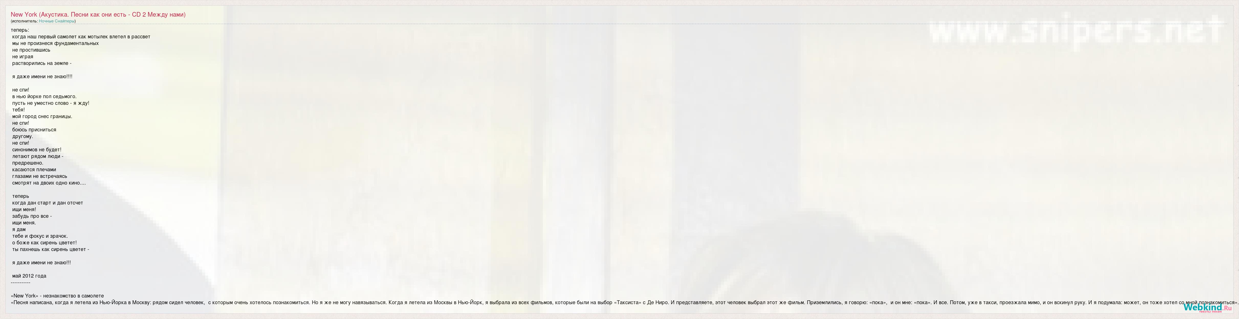 теперь: когда наш первый самолет как мотылек влетел в рассвет мы не произнеся фундаментальных не простившись не играя растворились на земле - я даже имени не знаю!!!! не спи! в нью йорке пол седьмого. пусть не уместно слово - я жду! тебя! мой город снес границы. не спи! боюсь присниться другому. не спи! синонимов не будет! летают рядом люди - предрешено. касаются плечами глазами не встречаясь смотрят на двоих одно кино.... теперь когда дан старт и дан отсчет ищи меня! забудь про все - ищи меня. я дам тебе и фокус и зрачок. о боже как сирень цветет! ты пахнешь как сирень цветет - я даже имени не знаю!!! май 2012 года ----------- «New York» - незнакомство в самолете «Песня написана, когда я летела из Нью-Йорка в Москву: рядом сидел человек, с которым очень хотелось познакомиться. Но я же не могу навязываться. Когда я летела из Москвы в Нью-Йорк, я выбрала из всех фильмов, которые были на выбор «Таксиста» с Де Ниро. И представляете, этот человек выбрал этот же фильм. Приземлились, я говорю: «пока», и он мне: «пока». И все. Потом, уже в такси, проезжала мимо, и он вскинул руку. И я подумала: может, он тоже хотел со мной познакомиться».