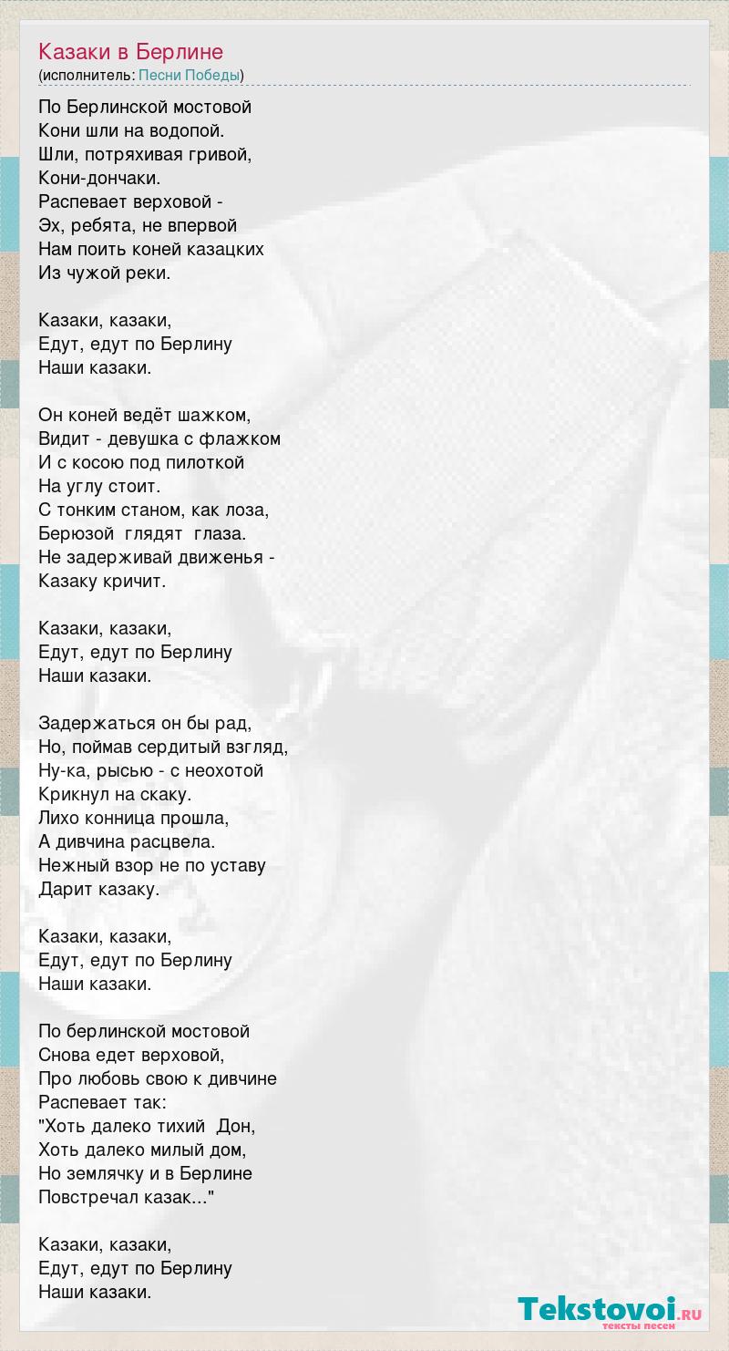 По Берлинской мостовой Кони шли на водопой. Шли, потряхивая гривой, Кони-дончаки. Распевает верховой - Эх, ребята, не впервой Нам поить коней казацких Из чужой реки. Казаки, казаки, Едут, едут по Берлину Наши казаки. Он коней ведёт шажком, Видит - девушка с флажком И с косою под пилоткой На углу стоит. С тонким станом, как лоза, Берюзой глядят глаза. Не задерживай движенья - Казаку кричит. Казаки, казаки, Едут, едут по Берлину Наши казаки. Задержаться он бы рад, Но, поймав сердитый взгляд, Ну-ка, рысью - с неохотой Крикнул на скаку. Лихо конница прошла, А дивчина расцвела. Нежный взор не по уставу Дарит казаку. Казаки, казаки, Едут, едут по Берлину Наши казаки. По берлинской мостовой Снова едет верховой, Про любовь свою к дивчине Распевает так: "Хоть далеко тихий Дон, Хоть далеко милый дом, Но землячку и в Берлине Повстречал казак..." Казаки, казаки, Едут, едут по Берлину Наши казаки.