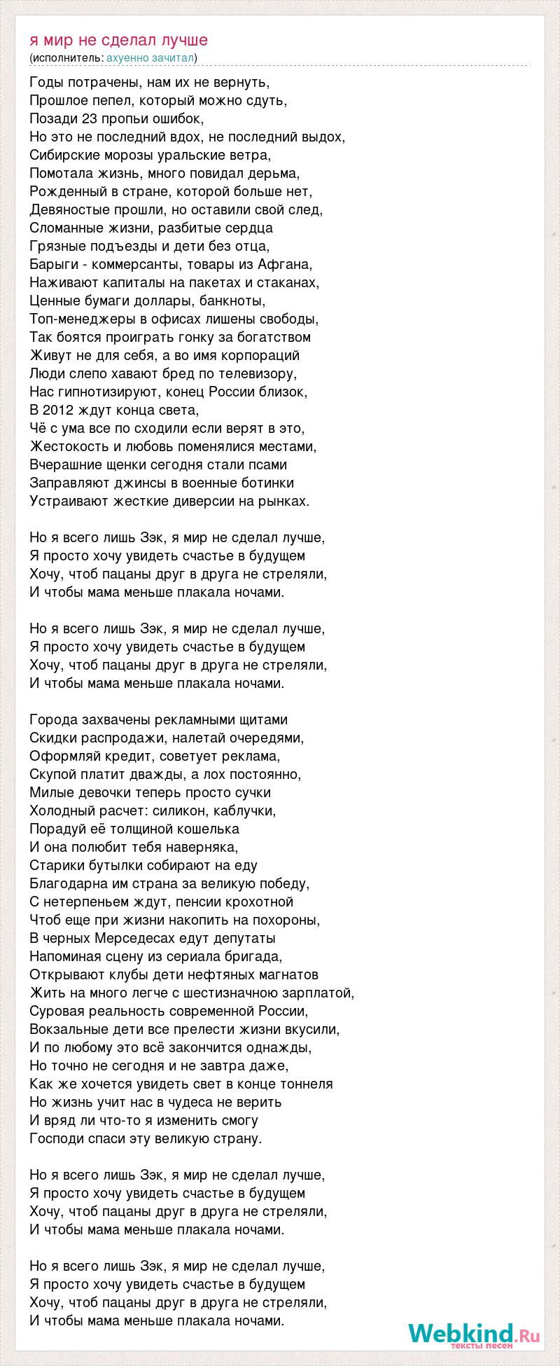 Годы потрачены, нам их не вернуть, Прошлое пепел, который можно сдуть, Позади 23 пропьи ошибок, Но это не последний вдох, не последний выдох, Сибирские морозы уральские ветра, Помотала жизнь, много повидал дерьма, Рожденный в стране, которой больше нет, Девяностые прошли, но оставили свой след, Сломанные жизни, разбитые сердца Грязные подъезды и дети без отца, Барыги - коммерсанты, товары из Афгана, Наживают капиталы на пакетах и стаканах, Ценные бумаги доллары, банкноты, Топ-менеджеры в офисах лишены свободы, Так боятся проиграть гонку за богатством Живут не для себя, а во имя корпораций Люди слепо хавают бред по телевизору, Нас гипнотизируют, конец России близок, В 2012 ждут конца света, Чё с ума все по сходили если верят в это, Жестокость и любовь поменялися местами, Вчерашние щенки сегодня стали псами Заправляют джинсы в военные ботинки Устраивают жесткие диверсии на рынках. Но я всего лишь Зэк, я мир не сделал лучше, Я просто хочу увидеть счастье в будущем Хочу, чтоб пацаны друг в друга не стреляли, И чтобы мама меньше плакала ночами. Но я всего лишь Зэк, я мир не сделал лучше, Я просто хочу увидеть счастье в будущем Хочу, чтоб пацаны друг в друга не стреляли, И чтобы мама меньше плакала ночами. Города захвачены рекламными щитами Скидки распродажи, налетай очередями, Оформляй кредит, советует реклама, Скупой платит дважды, а лох постоянно, Милые девочки теперь просто сучки Холодный расчет: силикон, каблучки, Порадуй её толщиной кошелька И она полюбит тебя наверняка, Старики бутылки собирают на еду Благодарна им страна за великую победу, С нетерпеньем ждут, пенсии крохотной Чтоб еще при жизни накопить на похороны, В черных Мерседесах едут депутаты Напоминая сцену из сериала бригада, Открывают клубы дети нефтяных магнатов Жить на много легче с шестизначною зарплатой, Суровая реальность современной России, Вокзальные дети все прелести жизни вкусили, И по любому это всё закончится однажды, Но точно не сегодня и не завтра даже, Как же хочется увидеть свет в конце тоннеля Но жизнь учит нас в чудеса не верить И вряд ли что-то я изменить смогу Господи спаси эту великую страну. Но я всего лишь Зэк, я мир не сделал лучше, Я просто хочу увидеть счастье в будущем Хочу, чтоб пацаны друг в друга не стреляли, И чтобы мама меньше плакала ночами. Но я всего лишь Зэк, я мир не сделал лучше, Я просто хочу увидеть счастье в будущем Хочу, чтоб пацаны друг в друга не стреляли, И чтобы мама меньше плакала ночами.