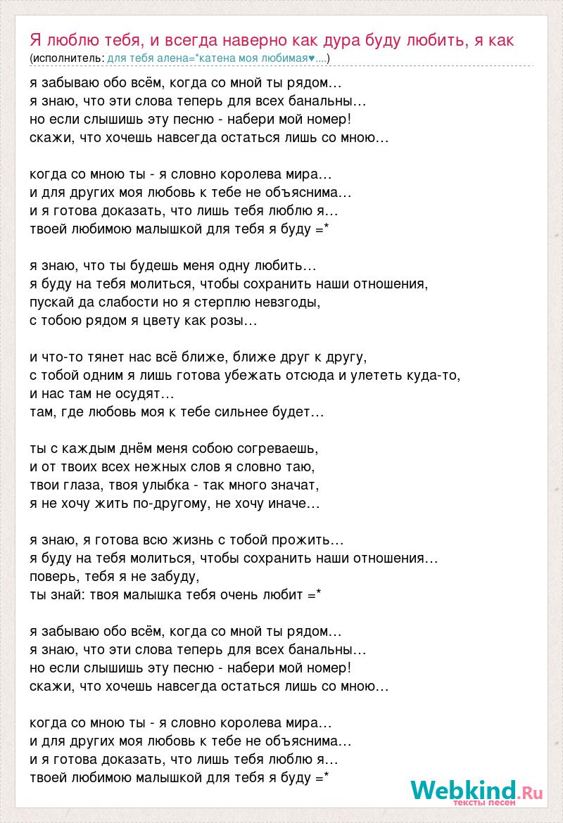 я забываю обо всём, когда со мной ты рядом… я знаю, что эти слова теперь для всех банальны… но если слышишь эту песню - набери мой номер! скажи, что хочешь навсегда остаться лишь со мною… когда со мною ты - я словно королева мира… и для других моя любовь к тебе не объяснима… и я готова доказать, что лишь тебя люблю я… твоей любимою малышкой для тебя я буду =* я знаю, что ты будешь меня одну любить… я буду на тебя молиться, чтобы сохранить наши отношения, пускай да слабости но я стерплю невзгоды, с тобою рядом я цвету как розы… и что-то тянет нас всё ближе, ближе друг к другу, с тобой одним я лишь готова убежать отсюда и улететь куда-то, и нас там не осудят… там, где любовь моя к тебе сильнее будет… ты с каждым днём меня собою согреваешь, и от твоих всех нежных слов я словно таю, твои глаза, твоя улыбка - так много значат, я не хочу жить по-другому, не хочу иначе… я знаю, я готова всю жизнь с тобой прожить… я буду на тебя молиться, чтобы сохранить наши отношения… поверь, тебя я не забуду, ты знай: твоя малышка тебя очень любит =* я забываю обо всём, когда со мной ты рядом… я знаю, что эти слова теперь для всех банальны… но если слышишь эту песню - набери мой номер! скажи, что хочешь навсегда остаться лишь со мною… когда со мною ты - я словно королева мира… и для других моя любовь к тебе не объяснима… и я готова доказать, что лишь тебя люблю я… твоей любимою малышкой для тебя я буду =*