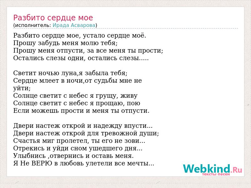 Разбито сердце мое, устало сердце моё. Прошу забудь меня молю тебя; Прошу меня отпусти, за все меня ты прости; Остались слезы одни, остались слезы..... Светит ночью луна,я забыла тебя; Сердце млеет в ночи,от судьбы мне не уйти; Солнце светит с небес я грущу, живу Солнце светит с небес я прощаю, пою Если можешь прости и меня ты отпусти. Двери настеж открой и надежду впусти... Двери настеж открой для тревожной души; Счастья миг пролетел, ты его не зови... Отрекись и уйди сном ушедшего дня... Улыбнись ,отвернись и оставь меня. Я Не ВЕРЮ в любовь улетели все мечты...