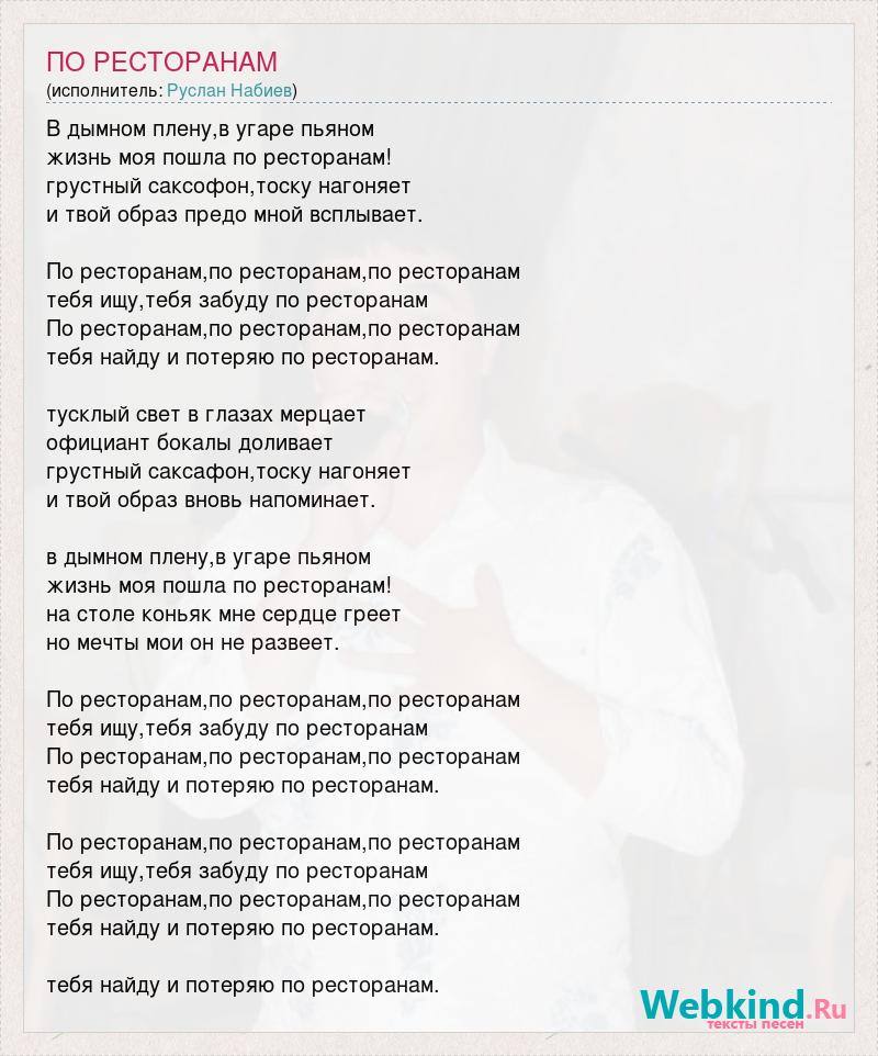 В дымном плену,в угаре пьяном жизнь моя пошла по ресторанам! грустный саксофон,тоску нагоняет и твой образ предо мной всплывает. По ресторанам,по ресторанам,по ресторанам тебя ищу,тебя забуду по ресторанам По ресторанам,по ресторанам,по ресторанам тебя найду и потеряю по ресторанам. тусклый свет в глазах мерцает официант бокалы доливает грустный саксафон,тоску нагоняет и твой образ вновь напоминает. в дымном плену,в угаре пьяном жизнь моя пошла по ресторанам! на столе коньяк мне сердце греет но мечты мои он не развеет. По ресторанам,по ресторанам,по ресторанам тебя ищу,тебя забуду по ресторанам По ресторанам,по ресторанам,по ресторанам тебя найду и потеряю по ресторанам. По ресторанам,по ресторанам,по ресторанам тебя ищу,тебя забуду по ресторанам По ресторанам,по ресторанам,по ресторанам тебя найду и потеряю по ресторанам. тебя найду и потеряю по ресторанам.