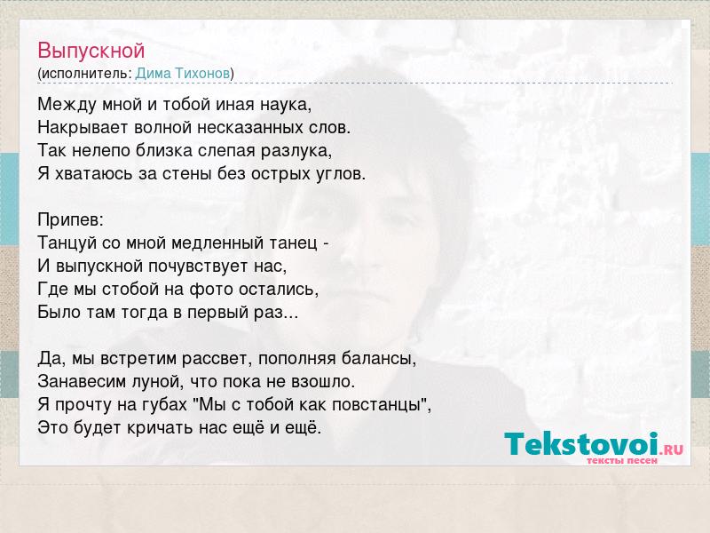 Между мной и тобой иная наука, Накрывает волной несказанных слов. Так нелепо близка слепая разлука, Я хватаюсь за стены без острых углов. Припев: Танцуй со мной медленный танец - И выпускной почувствует нас, Где мы стобой на фото остались, Было там тогда в первый раз... Да, мы встретим рассвет, пополняя балансы, Занавесим луной, что пока не взошло. Я прочту на губах "Мы с тобой как повстанцы", Это будет кричать нас ещё и ещё.