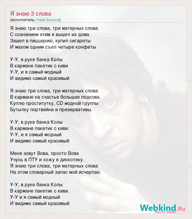 Я знаю три слова, три матерных слова С сознанием этим я вышел из дома Зашел в пиццерию, купил сигареты И махом одним съел четыре конфеты У-У, в руке банка Колы В кармане пакетик с киви У-У, и я самый модный И видимо самый красивый Я знаю три слова, три матерных слова В кармане на счастье большая подкова. Куплю проститутку, CD модной группы Бутылку портвейна и презервативы У-У, в руке банка Колы В кармане пакетик с киви. У-У, и я самый модный И видимо самый красивый Меня зовут Вова, просто Вова Учусь в ПТУ и хожу в дискотеку. Я знаю три слова, три матерных слова На этом словарный запас мой исчерпан. У-У, в руке банка Колы В кармане пакетик с киви. У-У и я самый модный И видимо самый красивый