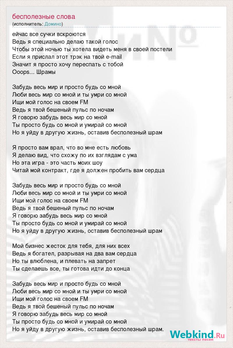 ейчас все сучки вскроются Ведь я специально делаю такой голос Чтобы этой ночью ты хотела видеть меня в своей постели Если я прислал этот трэк на твой e-mail Значит я просто хочу переспать с тобой Ooops... Шрамы Забудь весь мир и просто будь со мной Люби весь мир со мной и ты умри со мной Ищи мой голос на своем FM Ведь я твой бешеный пульс по ночам Я говорю забудь весь мир со мной Ты просто будь со мной и умирай со мной Но я уйду в другую жизнь, оставив бесполезный шрам Я просто вам врал, что во мне есть любовь Я делаю вид, что схожу по их взглядам с ума Но эта игра - это часть моих шоу Читай мой контракт, где я должен пробить вам сердца Забудь весь мир и просто будь со мной Люби весь мир со мной и ты умри со мной Ищи мой голос на своем FM Ведь я твой бешеный пульс по ночам Я говорю забудь весь мир со мной Ты просто будь со мной и умирай со мной Но я уйду в другую жизнь, оставив бесполезный шрам Мой бизнес жесток для тебя, для них всех Ведь я богател, разрывая на два вам сердца Но ты влюблена, и плевать на запрет Ты сделаешь все, ты готова идти до конца Забудь весь мир и просто будь со мной Люби весь мир со мной и ты умри со мной Ищи мой голос на своем FM Ведь я твой бешеный пульс по ночам Я говорю забудь весь мир со мной Ты просто будь со мной и умирай со мной Но я уйду в другую жизнь, оставив бесполезный шрам.