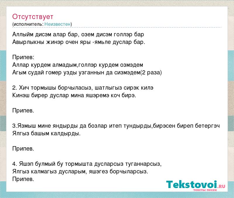 Аллыйм дисэм алар бар, озем дисэм голлэр бар Авырлыкны жинэр очен яры -ямьле дуслар бар. Припев: Аллар курдем алмадым,голлэр курдем озмэдем Агым судай гомер узды узганнын да сизмэдем(2 раза) 2. Хич тормышы борчыласыз, шатлыгыз сирэк килэ Кинэш бирер дуслар мина яшэремэ коч бирэ. Припев. 3.Язмыш мине яндырды да бозлар итеп тундырды,бирэсен биреп бетергэч Ялгыз башым калдырды. Припев. 4. Яшэп булмый бу тормышта дусларсыз туганнарсыз, Ялгыз калмагыз дусларым, яшэгез борчыларсыз. Припев.