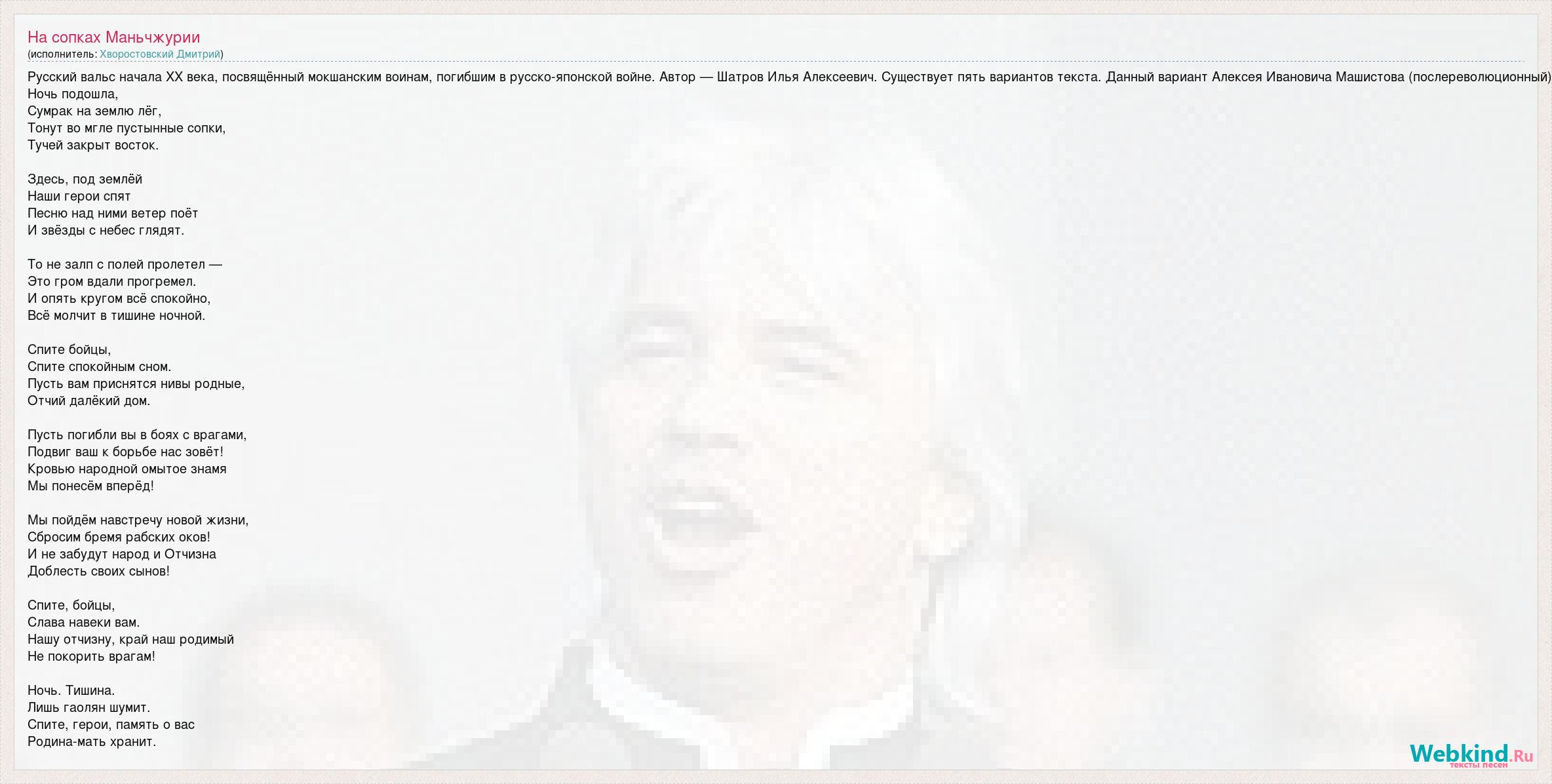 Русский вальс начала XX века, посвящённый мокшанским воинам, погибшим в русско-японской войне. Автор — Шатров Илья Алексеевич. Существует пять вариантов текста. Данный вариант Алексея Ивановича Машистова (послереволюционный) Ночь подошла, Сумрак на землю лёг, Тонут во мгле пустынные сопки, Тучей закрыт восток. Здесь, под землёй Наши герои спят Песню над ними ветер поёт И звёзды с небес глядят. То не залп с полей пролетел — Это гром вдали прогремел. И опять кругом всё спокойно, Всё молчит в тишине ночной. Спите бойцы, Спите спокойным сном. Пусть вам приснятся нивы родные, Отчий далёкий дом. Пусть погибли вы в боях с врагами, Подвиг ваш к борьбе нас зовёт! Кровью народной омытое знамя Мы понесём вперёд! Мы пойдём навстречу новой жизни, Сбросим бремя рабских оков! И не забудут народ и Отчизна Доблесть своих сынов! Спите, бойцы, Слава навеки вам. Нашу отчизну, край наш родимый Не покорить врагам! Ночь. Тишина. Лишь гаолян шумит. Спите, герои, память о вас Родина-мать хранит.