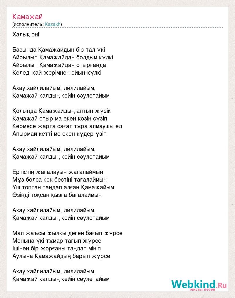 Халық әні Басында Қамажайдың бір тал үкі Айрылып Қамажайдан болдым күлкі Айрылып Қамажайдан отырғанда Келеді қай жерімнен ойын-күлкі Ахау хайлилайым, лилилайым, Қамажай қалдың кейін сәулетайым Қолында Қамажайдың алтын жүзік Қамажай отыр ма екен көзін сүзіп Көрмесе жарта сағат тұра алмаушы ед Апырмай кетті ме екен күдер үзіп Ахау хайлилайым, лилилайым, Қамажай қалдың кейін сәулетайым Ертістің жағалауын жағалаймын Мұз болса көк бестіні тағалаймын Үш топтан таңдап алған Қамажайым Өзіңді тоқсан қызға бағалаймын Ахау хайлилайым, лилилайым, Қамажай қалдың кейін сәулетайым Мал жаъсы жылқы деген бағып жүрсе Монына үкі-тұмар тағып жүрсе Ішінен бір жорғаны таңдап мініп Аулына Қамажайдың барып жүрсе Ахау хайлилайым, лилилайым, Қамажай қалдың кейін сәулетайым
