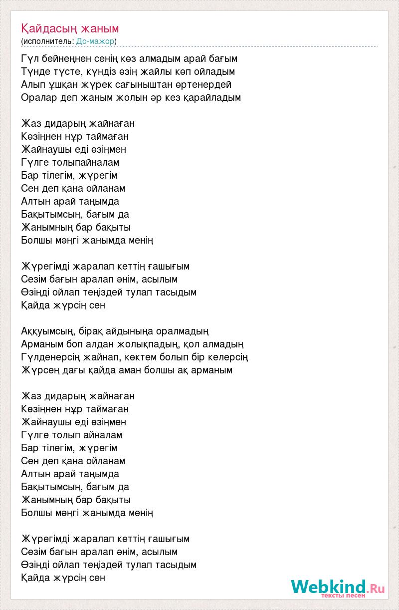 Гүл бейнеңнен сенің көз алмадым арай бағым Түнде түсте, күндіз өзің жайлы көп ойладым Алып ұшқан жүрек сағыныштан өртенердей Оралар деп жаным жолын әр кез қарайладым Жаз дидарың жайнаған Көзіңнен нұр таймаған Жайнаушы еді өзіңмен Гүлге толыпайналам Бар тілегім, жүрегім Сен деп қана ойланам Алтын арай таңымда Бақытымсың, бағым да Жанымның бар бақыты Болшы мәңгі жанымда менің Жүрегімді жаралап кеттің ғашығым Сезім бағын аралап әнім, асылым Өзіңді ойлап теңіздей тулап тасыдым Қайда жүрсің сен Аққуымсың, бірақ айдыныңа оралмадың Арманым боп алдан жолықпадың, қол алмадың Гүлденерсің жайнап, көктем болып бір келерсің Жүрсең дағы қайда аман болшы ақ арманым Жаз дидарың жайнаған Көзіңнен нұр таймаған Жайнаушы еді өзіңмен Гүлге толып айналам Бар тілегім, жүрегім Сен деп қана ойланам Алтын арай таңымда Бақытымсың, бағым да Жанымның бар бақыты Болшы мәңгі жанымда менің Жүрегімді жаралап кеттің ғашығым Сезім бағын аралап әнім, асылым Өзіңді ойлап теңіздей тулап тасыдым Қайда жүрсің сен