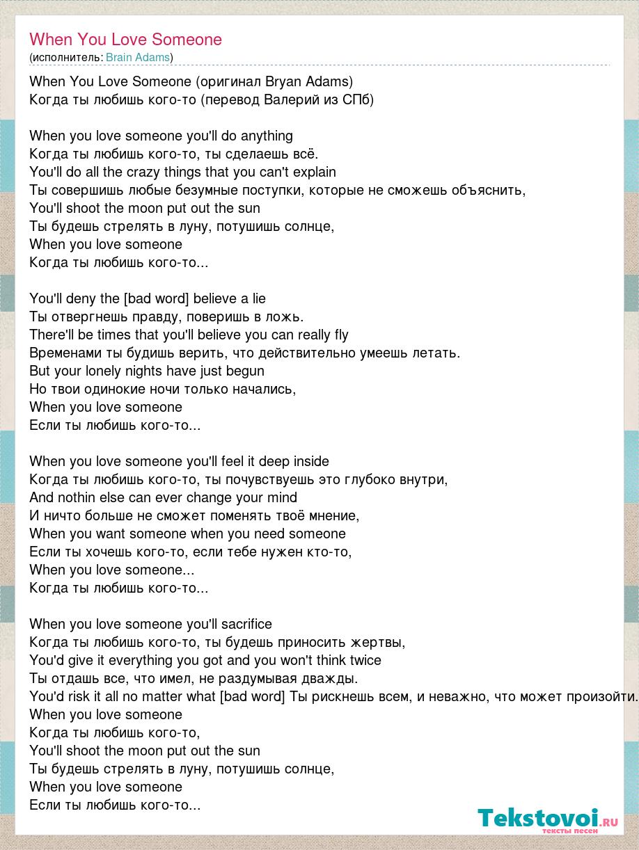 When You Love Someone (оригинал Bryan Adams) Когда ты любишь кого-то (перевод Валерий из СПб) When you love someone you'll do anything Когда ты любишь кого-то, ты сделаешь всё. You'll do all the crazy things that you can't explain Ты совершишь любые безумные поступки, которые не сможешь объяснить, You'll shoot the moon put out the sun Ты будешь стрелять в луну, потушишь солнце, When you love someone Когда ты любишь кого-то... You'll deny the truth believe a lie Ты отвергнешь правду, поверишь в ложь. There'll be times that you'll believe you can really fly Временами ты будишь верить, что действительно умеешь летать. But your lonely nights have just begun Но твои одинокие ночи только начались, When you love someone Если ты любишь кого-то... When you love someone you'll feel it deep inside Когда ты любишь кого-то, ты почувствуешь это глубоко внутри, And nothin else can ever change your mind И ничто больше не сможет поменять твоё мнение, When you want someone when you need someone Если ты хочешь кого-то, если тебе нужен кто-то, When you love someone... Когда ты любишь кого-то... When you love someone you'll sacrifice Когда ты любишь кого-то, ты будешь приносить жертвы, You'd give it everything you got and you won't think twice Ты отдашь все, что имел, не раздумывая дважды. You'd risk it all no matter what may come Ты рискнешь всем, и неважно, что может произойти. When you love someone Когда ты любишь кого-то, You'll shoot the moon put out the sun Ты будешь стрелять в луну, потушишь солнце, When you love someone Если ты любишь кого-то...