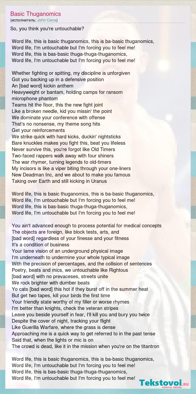 So, you think you're untouchable? Word life, this is basic thuganomics, this is ba-basic thuganomics, Word life, I'm untouchable but I'm forcing you to feel me! Word life, this is bas-basic thuga-thuga-thuganomics, Word life, I'm untouchable but I'm forcing you to feel me! Whether fighting or spitting, my discipline is unforgiven Got you backing up in a defensive position An [bad word] kickin anthem Heavyweight or bantam, holding camps for ransom microphone phantom Teams hit the floor, this the new fight joint Like a broken needle, kid you missin' the point We dominate your conference with offense That's no nonsense, my theme song hits Get your reinforcements We strike quick with hard kicks, duckin' nightsticks Bare knuckles makes you fight this, beat you lifeless Never survive this, you're forgot like Old Timers Two-faced rappers walk away with four shiners The war rhymer, turning legends to old-timers My incisors is like a viper biting through your one-liners New Deadman Inc, and we about to make you famous Taking over Earth and still kicking in Uranus Word life, this is basic thuganomics, this is ba-basic thuganomics, Word life, I'm untouchable but I'm forcing you to feel me! Word life, this is bas-basic thuga-thuga-thuganomics, Word life, I'm untouchable but I'm forcing you to feel me! You ain't advanced enough to process potential for medical concepts The objects are foreign, like block tests, arts, and [bad word] regardless of your finesse and your fitness It's a condition of business Your lame vision of an underground physical image I'm underneath to undermine your whole typical image With the precision of percentages, and the collision of sentences Poetry, beats and mics, we untouchable like Rightous [bad word] with no prevaceses, streets unite We rock brighter with dumber beats Yo cats [bad word] this hot if they burst off in the summer heat But get two tapes, kill your birds the first time Your friendly state worthy of my filler or worse rhymes I'm better than knights, check the veteran stripes Leave you beside yourself in fear, I'll kill you and bury you twice Despite the cover of night, tracking your flight Like Guerilla Warfare, where the grass is dense Approaching me is a quick way to get referred to in the past tense Said that, when the lights or mic is on The crowd is dead, like it in the mission when you're on the titantron Word life, this is basic thuganomics, this is ba-basic thuganomics, Word life, I'm untouchable but I'm forcing you to feel me! Word life, this is bas-basic thuga-thuga-thuganomics, Word life, I'm untouchable but I'm forcing you to feel me!