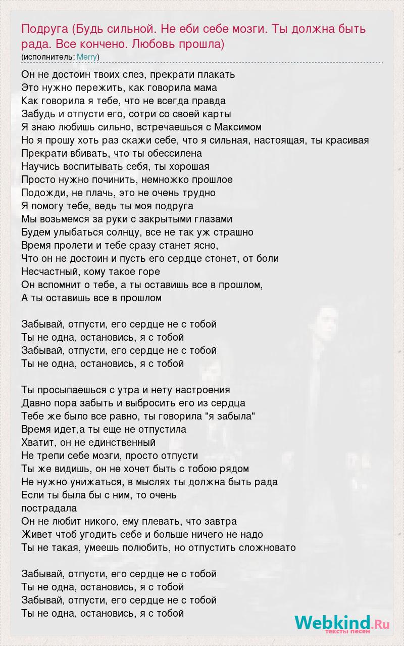 Он не достоин твоих слез, прекрати плакать Это нужно пережить, как говорила мама Как говорила я тебе, что не всегда правда Забудь и отпусти его, сотри со своей карты Я знаю любишь сильно, встречаешься с Максимом Но я прошу хоть раз скажи себе, что я сильная, настоящая, ты красивая Прекрати вбивать, что ты обессилена Научись воспитывать себя, ты хорошая Просто нужно починить, немножко прошлое Подожди, не плачь, это не очень трудно Я помогу тебе, ведь ты моя подруга Мы возьмемся за руки с закрытыми глазами Будем улыбаться солнцу, все не так уж страшно Время пролети и тебе сразу станет ясно, Что он не достоин и пусть его сердце стонет, от боли Несчастный, кому такое горе Он вспомнит о тебе, а ты оставишь все в прошлом, А ты оставишь все в прошлом Забывай, отпусти, его сердце не с тобой Ты не одна, остановись, я с тобой Забывай, отпусти, его сердце не с тобой Ты не одна, остановись, я с тобой Ты просыпаешься с утра и нету настроения Давно пора забыть и выбросить его из сердца Тебе же было все равно, ты говорила "я забыла" Время идет,а ты еще не отпустила Хватит, он не единственный Не трепи себе мозги, просто отпусти Ты же видишь, он не хочет быть с тобою рядом Не нужно унижаться, в мыслях ты должна быть рада Если ты была бы с ним, то очень пострадала Он не любит никого, ему плевать, что завтра Живет чтоб угодить себе и больше ничего не надо Ты не такая, умеешь полюбить, но отпустить сложновато Забывай, отпусти, его сердце не с тобой Ты не одна, остановись, я с тобой Забывай, отпусти, его сердце не с тобой Ты не одна, остановись, я с тобой
