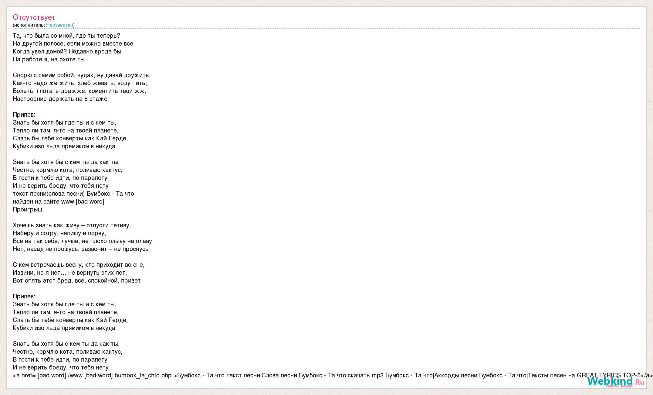 Та, что была со мной, где ты теперь? На другой полосе, если можно вместе все Когда увел домой? Недавно вроде бы На работе я, на охоте ты Спорю с самим собой, чудак, ну давай дружить, Как-то надо же жить, хлеб жевать, воду пить, Болеть, глотать дражже, коментить твой жж, Настроение держать на 8 этаже Припев: Знать бы хотя бы где ты и с кем ты, Тепло ли там, я-то на твоей планете, Слать бы тебе конверты как Кай Герде, Кубики изо льда прямиком в никуда Знать бы хотя бы с кем ты да как ты, Честно, кормлю кота, поливаю кактус, В гости к тебе идти, по парапету И не верить бреду, что тебя нету текст песни(слова песни) Бумбокс - Та что найден на сайте www [bad word] Проигрыш. Хочешь знать как живу – отпусти тетиву, Наберу и сотру, напишу и порву, Все на так себе, лучше, не плохо плыву на плаву Нет, назад не прошусь, зазвонит – не проснусь С кем встречаешь весну, кто приходит во сне, Извини, но я нет… не вернуть этих лет, Вот опять этот бред, все, спокойной, привет Припев: Знать бы хотя бы где ты и с кем ты, Тепло ли там, я-то на твоей планете, Слать бы тебе конверты как Кай Герде, Кубики изо льда прямиком в никуда Знать бы хотя бы с кем ты да как ты, Честно, кормлю кота, поливаю кактус, В гости к тебе идти, по парапету И не верить бреду, что тебя нету <a href= [bad word] /www [bad word] bumbox_ta_chto.php">Бумбокс - Та что текст песни|Слова песни Бумбокс - Та что|скачать mp3 Бумбокс - Та что|Аккорды песни Бумбокс - Та что|Тексты песен на GREAT LYRICS TOP-5</a>