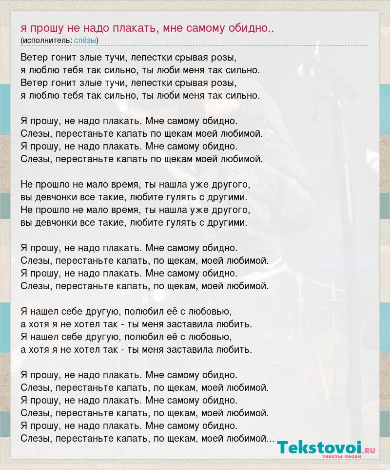 Ветер гонит злые тучи, лепестки срывая розы, я люблю тебя так сильно, ты люби меня так сильно. Ветер гонит злые тучи, лепестки срывая розы, я люблю тебя так сильно, ты люби меня так сильно. Я прошу, не надо плакать. Мне самому обидно. Слезы, перестаньте капать по щекам моей любимой. Я прошу, не надо плакать. Мне самому обидно. Слезы, перестаньте капать по щекам моей любимой. Не прошло не мало время, ты нашла уже другого, вы девчонки все такие, любите гулять с другими. Не прошло не мало время, ты нашла уже другого, вы девчонки все такие, любите гулять с другими. Я прошу, не надо плакать. Мне самому обидно. Слезы, перестаньте капать, по щекам, моей любимой. Я прошу, не надо плакать. Мне самому обидно. Слезы, перестаньте капать, по щекам, моей любимой. Я нашел себе другую, полюбил её с любовью, а хотя я не хотел так - ты меня заставила любить. Я нашел себе другую, полюбил её с любовью, а хотя я не хотел так - ты меня заставила любить. Я прошу, не надо плакать. Мне самому обидно. Слезы, перестаньте капать, по щекам, моей любимой. Я прошу, не надо плакать. Мне самому обидно. Слезы, перестаньте капать, по щекам, моей любимой. Я прошу, не надо плакать. Мне самому обидно. Слезы, перестаньте капать, по щекам, моей любимой...