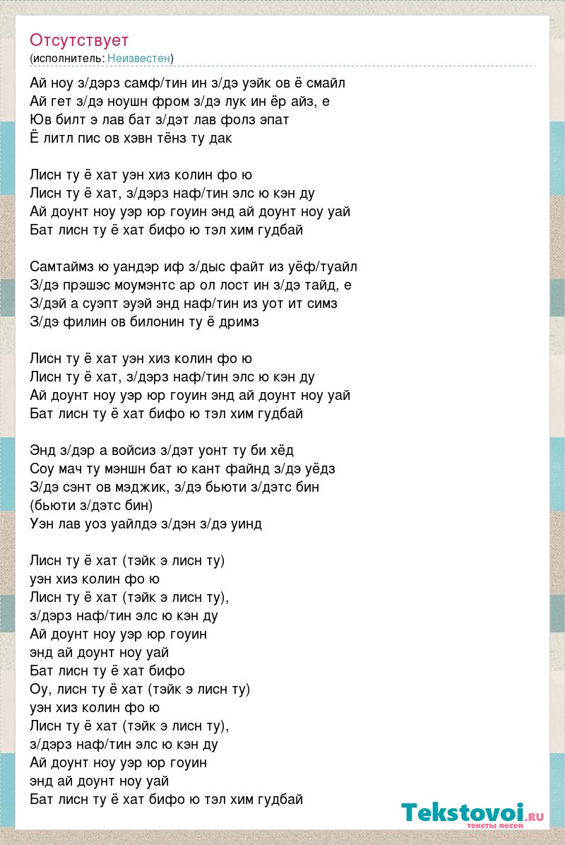 Ай ноу з/дэрз самф/тин ин з/дэ уэйк ов ё смайл Ай гет з/дэ ноушн фром з/дэ лук ин ёр айз, е Юв билт э лав бат з/дэт лав фолз эпат Ё литл пис ов хэвн тёнз ту дак Лисн ту ё хат уэн хиз колин фо ю Лисн ту ё хат, з/дэрз наф/тин элс ю кэн ду Ай доунт ноу уэр юр гоуин энд ай доунт ноу уай Бат лисн ту ё хат бифо ю тэл хим гудбай Самтаймз ю уандэр иф з/дыс файт из уёф/туайл З/дэ прэшэс моумэнтс ар ол лост ин з/дэ тайд, е З/дэй а суэпт эуэй энд наф/тин из уот ит симз З/дэ филин ов билонин ту ё дримз Лисн ту ё хат уэн хиз колин фо ю Лисн ту ё хат, з/дэрз наф/тин элс ю кэн ду Ай доунт ноу уэр юр гоуин энд ай доунт ноу уай Бат лисн ту ё хат бифо ю тэл хим гудбай Энд з/дэр а войсиз з/дэт уонт ту би хёд Соу мач ту мэншн бат ю кант файнд з/дэ уёдз З/дэ сэнт ов мэджик, з/дэ бьюти з/дэтс бин (бьюти з/дэтс бин) Уэн лав уоз уайлдэ з/дэн з/дэ уинд Лисн ту ё хат (тэйк э лисн ту) уэн хиз колин фо ю Лисн ту ё хат (тэйк э лисн ту), з/дэрз наф/тин элс ю кэн ду Ай доунт ноу уэр юр гоуин энд ай доунт ноу уай Бат лисн ту ё хат бифо Оу, лисн ту ё хат (тэйк э лисн ту) уэн хиз колин фо ю Лисн ту ё хат (тэйк э лисн ту), з/дэрз наф/тин элс ю кэн ду Ай доунт ноу уэр юр гоуин энд ай доунт ноу уай Бат лисн ту ё хат бифо ю тэл хим гудбай
