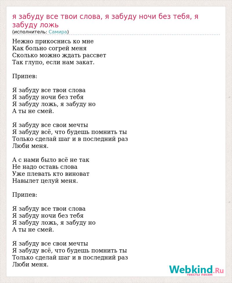 Нежно прикоснись ко мне Как больно согрей меня Сколько можно ждать рассвет Так глупо, если нам закат. Припев: Я забуду все твои слова Я забуду ночи без тебя Я забуду ложь, я забуду но А ты не смей. Я забуду все свои мечты Я забуду всё, что будешь помнить ты Только сделай шаг и в последний раз Люби меня. А с нами было всё не так Не надо оставь слова Уже плевать кто виноват Навылет целуй меня. Припев: Я забуду все твои слова Я забуду ночи без тебя Я забуду ложь, я забуду но А ты не смей. Я забуду все свои мечты Я забуду всё, что будешь помнить ты Только сделай шаг и в последний раз Люби меня.