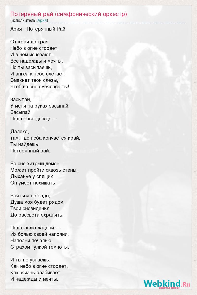 Ария - Потерянный Рай От края до края Небо в огне сгорает, И в нем исчезают Все надежды и мечты. Но ты засыпаешь, И ангел к тебе слетает, Смахнет твои слезы, Чтоб во сне смеялась ты! 3асыпай, У меня на руках засыпай, Засыпай Под пенье дождя... Далеко, там, где неба кончается край, Ты найдешь Потерянный рай. Во сне хитрый демон Может пройти сквозь стены, Дыханье у спящих Он умеет похищать. Бояться не надо, Душа моя будет рядом. Твои сновиденья До рассвета охранять. Подставлю ладони — Их болью своей наполни, Наполни печалью, Страхом гулкой темноты, И ты не узнаешь, Как небо в огне сгорает, Как жизнь разбивает И надежды и мечты.