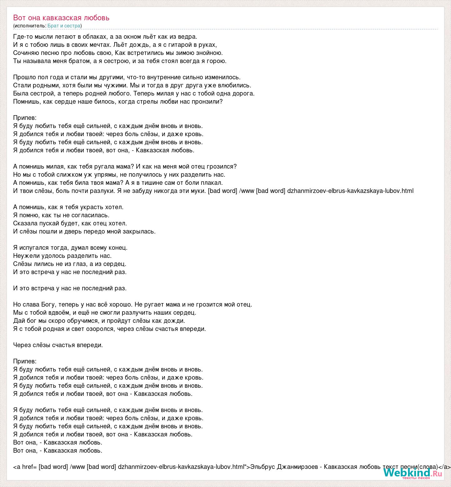 Где-то мысли летают в облаках, а за окном льёт как из ведра. И я с тобою лишь в своих мечтах. Льёт дождь, а я с гитарой в руках, Сочиняю песню про любовь свою, Как встретились мы зимою знойною. Ты называла меня братом, а я сестрою, и за тебя стоял всегда я горою. Прошло пол года и стали мы другими, что-то внутренние сильно изменилось. Стали родными, хотя были мы чужими. Мы и тогда в друг друга уже влюбились. Была сестрой, а теперь родней любого. Теперь милая у нас с тобой одна дорога. Помнишь, как сердце наше билось, когда стрелы любви нас пронзили? Припев: Я буду любить тебя ещё сильней, с каждым днём вновь и вновь. Я добился тебя и любви твоей: через боль слёзы, и даже кровь. Я буду любить тебя ещё сильней, с каждым днём вновь и вновь. Я добился тебя и любви твоей, вот она, - Кавказская любовь. А помнишь милая, как тебя ругала мама? И как на меня мой отец грозился? Но мы с тобой слижком уж упрямы, не получилось у них разделить нас. А помнишь, как тебя била твоя мама? А я в тишине сам от боли плакал. И твои слёзы, боль почти разлуки. Я не забуду никогда эти муки. [bad word] /www [bad word] dzhanmirzoev-elbrus-kavkazskaya-lubov.html А помнишь, как я тебя украсть хотел. Я помню, как ты не согласилась. Сказала пускай будет, как отец хотел. И слёзы пошли и дверь передо мной закрылась. Я испугался тогда, думал всему конец. Неужели удолось разделить нас. Слёзы лились не из глаз, а из сердец. И это встреча у нас не последний раз. И это встреча у нас не последний раз. Но слава Богу, теперь у нас всё хорошо. Не ругает мама и не грозится мой отец. Мы с тобой вдвоём, и ещё не смогли разлучить наших сердец. Дай бог мы скоро обручимся, и пройдут слёзы как дожди. Я с тобой родная и свет озоролся, через слёзы счастья впереди. Через слёзы счастья впереди. Припев: Я буду любить тебя ещё сильней, с каждым днём вновь и вновь. Я добился тебя и любви твоей: через боль слёзы, и даже кровь. Я буду любить тебя ещё сильней, с каждым днём вновь и вновь. Я добился тебя и любви твоей, вот она - Кавказская любовь. Я буду любить тебя ещё сильней, с каждым днём вновь и вновь. Я добился тебя и любви твоей: через боль слёзы, и даже кровь. Я буду любить тебя ещё сильней, с каждым днём вновь и вновь. Я добился тебя и любви твоей, вот она - Кавказская любовь. Вот она, - Кавказская любовь. Вот она, - Кавказская любовь. <a href= [bad word] /www [bad word] dzhanmirzoev-elbrus-kavkazskaya-lubov.html">Эльбрус Джанмирзоев - Кавказская любовь текст песни(слова)</a>