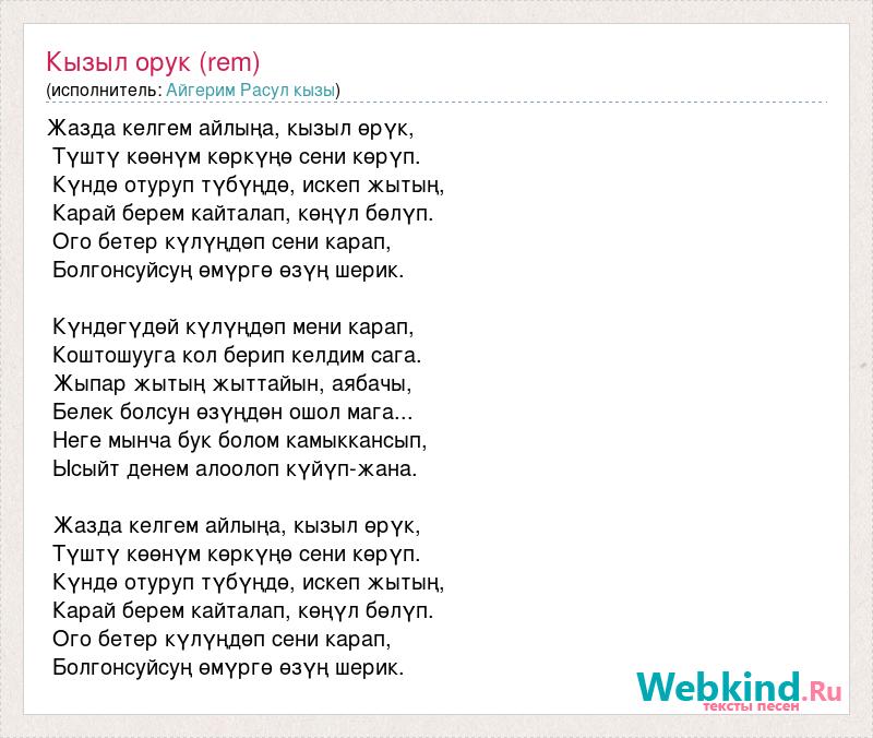 Жазда келгем айлыңа, кызыл өрүк, Түштү көөнүм көркүңө сени көрүп. Күндө отуруп түбүңдө, искеп жытың, Карай берем кайталап, көңүл бөлүп. Ого бетер күлүңдөп сени карап, Болгонсуйсуң өмүргө өзүң шерик. Күндөгүдөй күлүңдөп мени карап, Коштошууга кол берип келдим сага. Жыпар жытың жыттайын, аябачы, Белек болсун өзүңдөн ошол мага... Неге мынча бук болом камыккансып, Ысыйт денем алоолоп күйүп-жана. Жазда келгем айлыңа, кызыл өрүк, Түштү көөнүм көркүңө сени көрүп. Күндө отуруп түбүңдө, искеп жытың, Карай берем кайталап, көңүл бөлүп. Ого бетер күлүңдөп сени карап, Болгонсуйсуң өмүргө өзүң шерик.