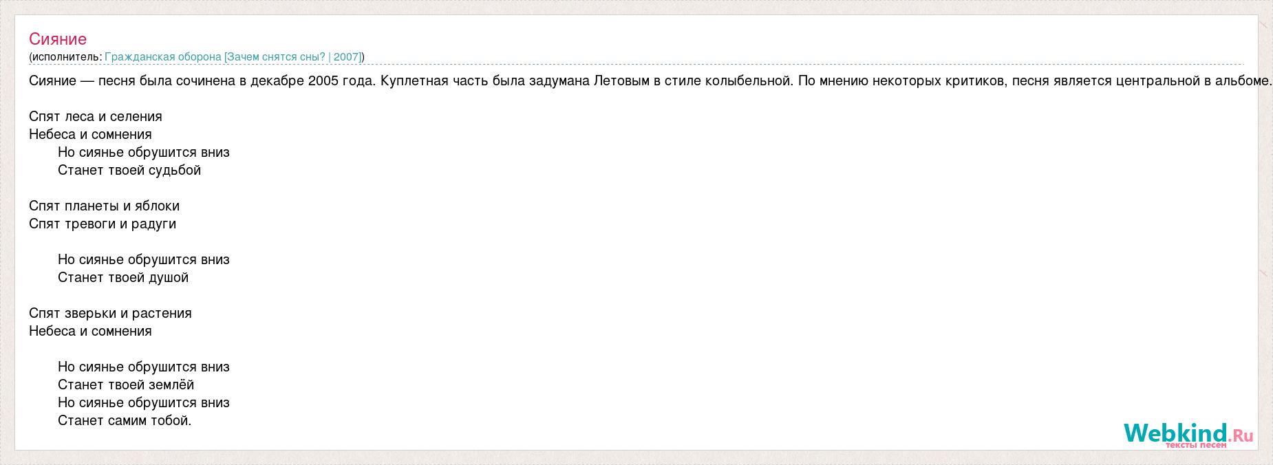 Сияние — песня была сочинена в декабре 2005 года. Куплетная часть была задумана Летовым в стиле колыбельной. По мнению некоторых критиков, песня является центральной в альбоме.