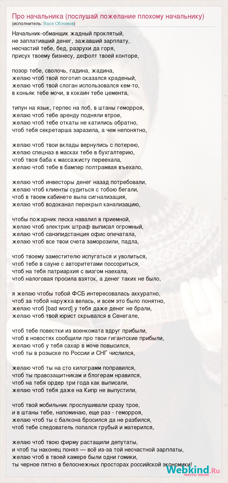 Начальник-обманщик жадный проклятый, не заплативший денег, зажавший зарплату, несчастий тебе, бед, разрухи да горя, присух твоему бизнесу, дефолт твоей конторе, позор тебе, сволочь, гадина, жадина, желаю чтоб твой логотип оказался краденый, желаю чтоб твой слоган использовался кем-то, в коньяк тебе мочи, в кокаин тебе цемента, типун на язык, герпес на лоб, в штаны геморроя, желаю чтоб тебе аренду подняли втрое, желаю чтоб тебе откаты не катились обратно, чтоб тебя секретарша заразила, а чем непонятно, желаю чтоб твои вклады вернулись с потерею, желаю спецназ в масках тебе в бухгалтерию, чтоб твоя баба к массажисту переехала, желаю чтоб тебе в бампер полтрамвая въехало, желаю чтоб инвесторы денег назад потребовали, желаю чтоб клиенты судиться с тобою бегали, чтоб в твоем кабинете выла сигнализация, желаю чтоб водоканал перекрыл канализацию, чтобы пожарник песка навалил в приемной, желаю чтоб электрик штраф выписал огромный, желаю чтоб санэпидстанция офис опечатала, желаю чтоб все твои счета заморозили, падла, чтоб твоему заместителю испугаться и уволиться, чтоб тебе в сауне с авторитетами поссориться, чтоб на тебя патриархия с визгом наехала, чтоб налоговая просила взяток, а денег таких не было, я желаю чтобы тобой ФСБ интересовалась аккуратно, чтоб за тобой наружка велась, и всем это было понятно, желаю чтоб [bad word] у тебя даже денег не брали, желаю чтоб твой юрист скрывался в Сенегале, чтоб тебе повестки из военкомата вдруг прибыли, чтоб в новостях сообщили про твои гигантские прибыли, желаю чтоб у тебя сахар в моче повысился, чтоб ты в розыске по России и СНГ числился, желаю чтоб ты на сто килограмм поправился, чтоб ты правозащитникам и блогерам нравился, чтоб на тебя ордер три года как выписали, желаю чтоб тебя даже на Кипр не выпустили, чтоб твой мобильник прослушивали сразу трое, и в штаны тебе, напоминаю, еще раз - геморроя, желаю чтоб ты с балкона бросился да не разбился, чтоб тебе следователь попался грубый и матерился, желаю чтоб твою фирму растащили депутаты, и чтоб ты наконец понял — всё из-за той несчастной зарплаты, желаю чтоб в твоей камере были одни гомики, ты черное пятно в белоснежных просторах российской экономики!