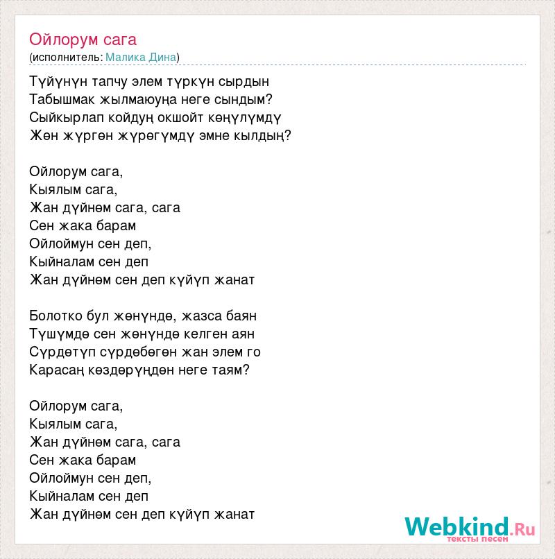 Түйүнүн тапчу элем түркүн сырдын Табышмак жылмаюуңа неге сындым? Сыйкырлап койдуң окшойт көңүлүмдү Жөн жүргөн жүрөгүмдү эмне кылдың? Ойлорум сага, Кыялым сага, Жан дүйнөм сага, сага Сен жака барам Ойлоймун сен деп, Кыйналам сен деп Жан дүйнөм сен деп күйүп жанат Болотко бул жөнүндө, жазса баян Түшүмдө сен жөнүндө келген аян Сүрдөтүп сүрдөбөгөн жан элем го Карасаң көздөрүңдөн неге таям? Ойлорум сага, Кыялым сага, Жан дүйнөм сага, сага Сен жака барам Ойлоймун сен деп, Кыйналам сен деп Жан дүйнөм сен деп күйүп жанат