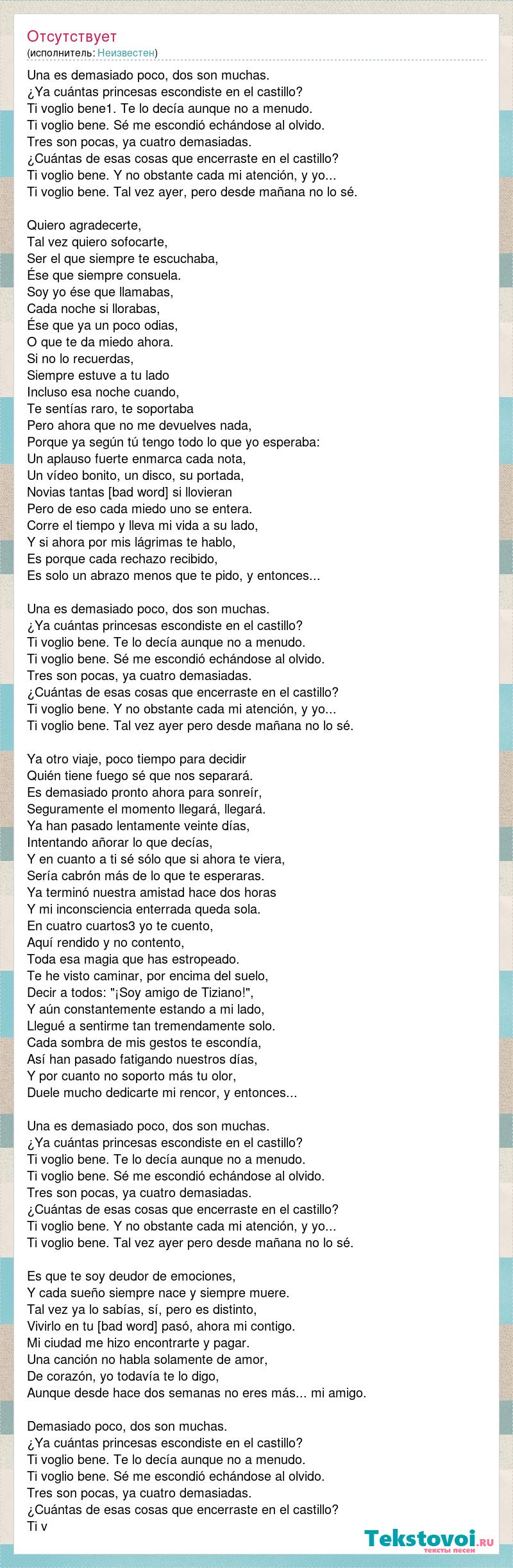 Una es demasiado poco, dos son muchas. ¿Ya cuántas princesas escondiste en el castillo? Ti voglio bene1. Te lo decía aunque no a menudo. Ti voglio bene. Sé me escondió echándose al olvido. Tres son pocas, ya cuatro demasiadas. ¿Cuántas de esas cosas que encerraste en el castillo? Ti voglio bene. Y no obstante cada mi atención, y yo... Ti voglio bene. Tal vez ayer, pero desde mañana no lo sé. Quiero agradecerte, Tal vez quiero sofocarte, Ser el que siempre te escuchaba, Ése que siempre consuela. Soy yo ése que llamabas, Cada noche si llorabas, Ése que ya un poco odias, O que te da miedo ahora. Si no lo recuerdas, Siempre estuve a tu lado Incluso esa noche cuando, Te sentías raro, te soportaba Pero ahora que no me devuelves nada, Porque ya según tú tengo todo lo que yo esperaba: Un aplauso fuerte enmarca cada nota, Un vídeo bonito, un disco, su portada, Novias tantas casi como si llovieran Pero de eso cada miedo uno se entera. Corre el tiempo y lleva mi vida a su lado, Y si ahora por mis lágrimas te hablo, Es porque cada rechazo recibido, Es solo un abrazo menos que te pido, y entonces... Una es demasiado poco, dos son muchas. ¿Ya cuántas princesas escondiste en el castillo? Ti voglio bene. Te lo decía aunque no a menudo. Ti voglio bene. Sé me escondió echándose al olvido. Tres son pocas, ya cuatro demasiadas. ¿Cuántas de esas cosas que encerraste en el castillo? Ti voglio bene. Y no obstante cada mi atención, y yo... Ti voglio bene. Tal vez ayer pero desde mañana no lo sé. Ya otro viaje, poco tiempo para decidir Quién tiene fuego sé que nos separará. Es demasiado pronto ahora para sonreír, Seguramente el momento llegará, llegará. Ya han pasado lentamente veinte días, Intentando añorar lo que decías, Y en cuanto a ti sé sólo que si ahora te viera, Sería cabrón más de lo que te esperaras. Ya terminó nuestra amistad hace dos horas Y mi inconsciencia enterrada queda sola. En cuatro cuartos3 yo te cuento, Aquí rendido y no contento, Toda esa magia que has estropeado. Te he visto caminar, por encima del suelo, Decir a todos: "¡Soy amigo de Tiziano!", Y aún constantemente estando a mi lado, Llegué a sentirme tan tremendamente solo. Cada sombra de mis gestos te escondía, Así han pasado fatigando nuestros días, Y por cuanto no soporto más tu olor, Duele mucho dedicarte mi rencor, y entonces... Una es demasiado poco, dos son muchas. ¿Ya cuántas princesas escondiste en el castillo? Ti voglio bene. Te lo decía aunque no a menudo. Ti voglio bene. Sé me escondió echándose al olvido. Tres son pocas, ya cuatro demasiadas. ¿Cuántas de esas cosas que encerraste en el castillo? Ti voglio bene. Y no obstante cada mi atención, y yo... Ti voglio bene. Tal vez ayer pero desde mañana no lo sé. Es que te soy deudor de emociones, Y cada sueño siempre nace y siempre muere. Tal vez ya lo sabías, sí, pero es distinto, Vivirlo en tu piel como pasó, ahora mi contigo. Mi ciudad me hizo encontrarte y pagar. Una canción no habla solamente de amor, De corazón, yo todavía te lo digo, Aunque desde hace dos semanas no eres más... mi amigo. Demasiado poco, dos son muchas. ¿Ya cuántas princesas escondiste en el castillo? Ti voglio bene. Te lo decía aunque no a menudo. Ti voglio bene. Sé me escondió echándose al olvido. Tres son pocas, ya cuatro demasiadas. ¿Cuántas de esas cosas que encerraste en el castillo? Ti v