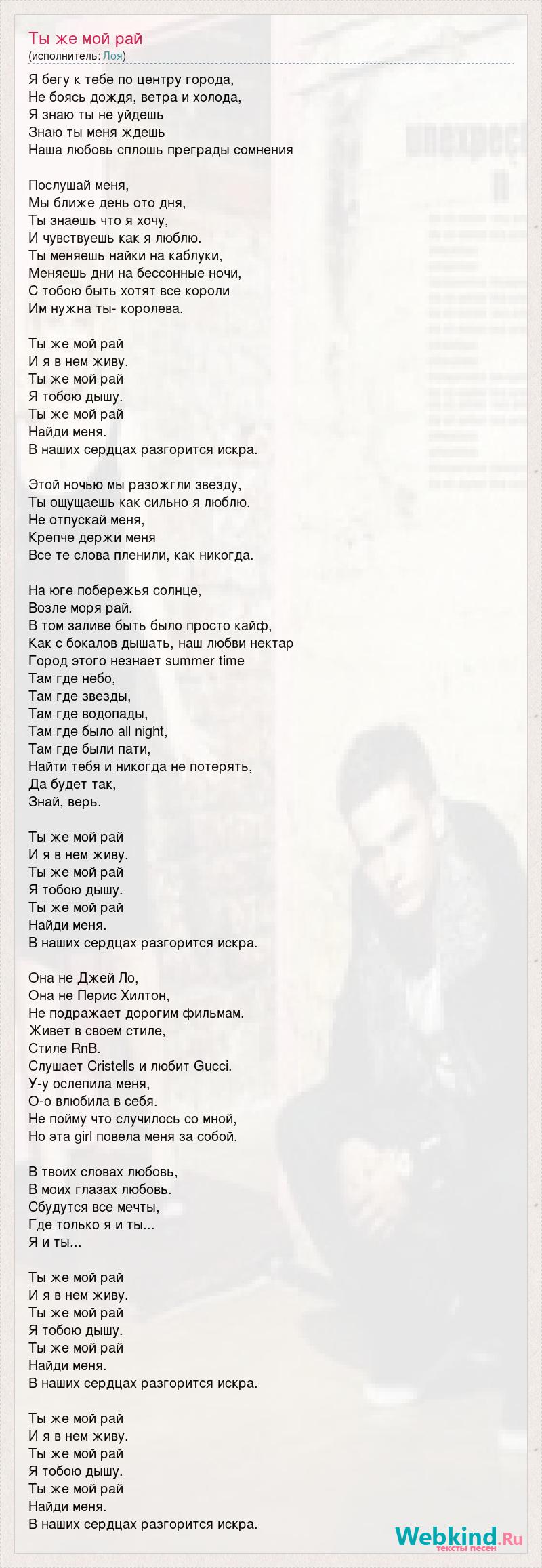 Я бегу к тебе по центру города, Не боясь дождя, ветра и холода, Я знаю ты не уйдешь Знаю ты меня ждешь Наша любовь сплошь преграды сомнения Послушай меня, Мы ближе день ото дня, Ты знаешь что я хочу, И чувствуешь как я люблю. Ты меняешь найки на каблуки, Меняешь дни на бессонные ночи, С тобою быть хотят все короли Им нужна ты- королева. Ты же мой рай И я в нем живу. Ты же мой рай Я тобою дышу. Ты же мой рай Найди меня. В наших сердцах разгорится искра. Этой ночью мы разожгли звезду, Ты ощущаешь как сильно я люблю. Не отпускай меня, Крепче держи меня Все те слова пленили, как никогда. На юге побережья cолнце, Возле моря рай. В том заливе быть было просто кайф, Как с бокалов дышать, наш любви нектар Город этого незнает summer time Там где небо, Там где звезды, Там где водопады, Там где было all night, Там где были пати, Найти тебя и никогда не потерять, Да будет так, Знай, верь. Ты же мой рай И я в нем живу. Ты же мой рай Я тобою дышу. Ты же мой рай Найди меня. В наших сердцах разгорится искра. Она не Джей Ло, Она не Перис Хилтон, Не подражает дорогим фильмам. Живет в своем стиле, Стиле RnB. Cлушает Cristells и любит Gucci. У-у ослепила меня, О-о влюбила в себя. Не пойму что случилось со мной, Но эта girl повела меня за собой. В твоих словах любовь, В моих глазах любовь. Сбудутся все мечты, Где только я и ты... Я и ты... Ты же мой рай И я в нем живу. Ты же мой рай Я тобою дышу. Ты же мой рай Найди меня. В наших сердцах разгорится искра. Ты же мой рай И я в нем живу. Ты же мой рай Я тобою дышу. Ты же мой рай Найди меня. В наших сердцах разгорится искра.