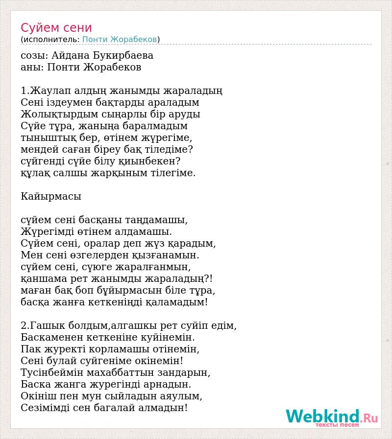 созы: Айдана Букирбаева аны: Понти Жорабеков 1.Жаулап алдың жанымды жараладың Сені іздеумен бақтарды араладым Жолықтырдым сыңарлы бір аруды Сүйе тұра, жаныңа баралмадым тыныштық бер, өтінем жүрегіме, мендей саған біреу бақ тіледіме? сүйгенді сүйе білу қиынбекен? құлақ салшы жарқыным тілегіме. Кайырмасы сүйем сені басқаны таңдамашы, Жүрегімді өтінем алдамашы. Сүйем сені, оралар деп жүз қарадым, Мен сені өзгелерден қызғанамын. сүйем сені, сүюге жаралғанмын, қаншама рет жанымды жараладың?! маған бақ боп бұйырмасын біле тұра, басқа жанға кеткеніңді қаламадым! 2.Гашык болдым,алгашкы рет суйiп едім, Баскаменен кеткенiне куйiнемін. Пак журектi корламашы отiнемін, Сенi булай суйгенiме окiнемін! Тусiнбеймiн махаббаттын зандарын, Баска жанга журегiндi арнадын. Окiнiш пен мун сыйладын аяулым, Сезiмiмдi сен багалай алмадын!