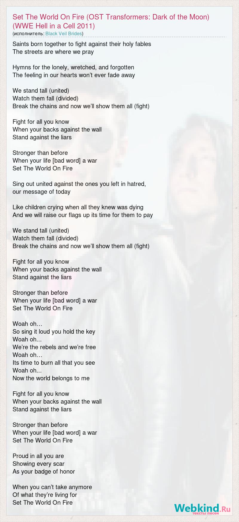 Saints born together to fight against their holy fables The streets are where we pray Hymns for the lonely, wretched, and forgotten The feeling in our hearts won’t ever fade away We stand tall (united) Watch them fall (divided) Break the chains and now we’ll show them all (fight) Fight for all you know When your backs against the wall Stand against the liars Stronger than before When your life [bad word] a war Set The World On Fire Sing out united against the ones you left in hatred, our message of today Like children crying when all they knew was dying And we will raise our flags up its time for them to pay We stand tall (united) Watch them fall (divided) Break the chains and now we’ll show them all (fight) Fight for all you know When your backs against the wall Stand against the liars Stronger than before When your life [bad word] a war Set The World On Fire Woah oh… So sing it loud you hold the key Woah oh... We’re the rebels and we’re free Woah oh… Its time to burn all that you see Woah oh... Now the world belongs to me Fight for all you know When your backs against the wall Stand against the liars Stronger than before When your life [bad word] a war Set The World On Fire Proud in all you are Showing every scar As your badge of honor When you can’t take anymore Of what they’re living for Set The World On Fire