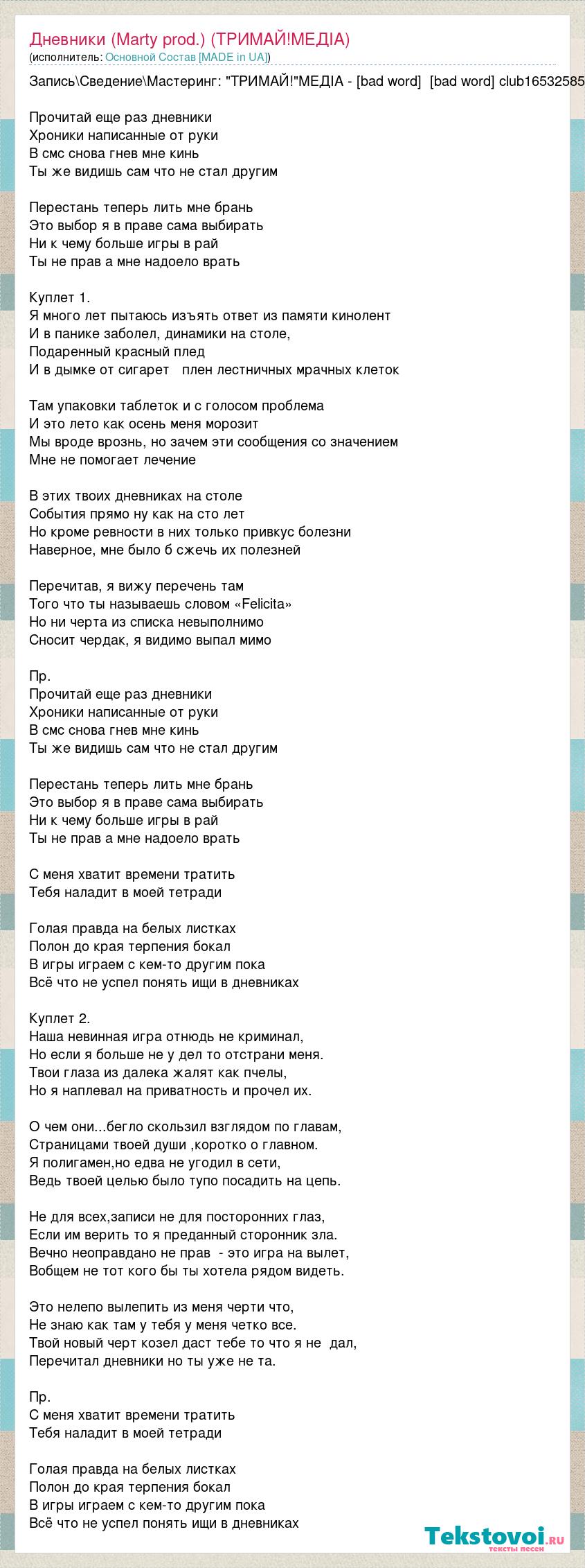 Запись\Сведение\Мастеринг: "ТРИМАЙ!"МЕДІА - [bad word] [bad word] club16532585 Прочитай еще раз дневники Хроники написанные от руки В смс снова гнев мне кинь Ты же видишь сам что не стал другим Перестань теперь лить мне брань Это выбор я в праве сама выбирать Ни к чему больше игры в рай Ты не прав а мне надоело врать Куплет 1. Я много лет пытаюсь изъять ответ из памяти кинолент И в панике заболел, динамики на столе, Подаренный красный плед И в дымке от сигарет плен лестничных мрачных клеток Там упаковки таблеток и с голосом проблема И это лето как осень меня морозит Мы вроде врознь, но зачем эти сообщения со значением Мне не помогает лечение В этих твоих дневниках на столе События прямо ну как на сто лет Но кроме ревности в них только привкус болезни Наверное, мне было б сжечь их полезней Перечитав, я вижу перечень там Того что ты называешь словом «Felicita» Но ни черта из списка невыполнимо Сносит чердак, я видимо выпал мимо Пр. Прочитай еще раз дневники Хроники написанные от руки В смс снова гнев мне кинь Ты же видишь сам что не стал другим Перестань теперь лить мне брань Это выбор я в праве сама выбирать Ни к чему больше игры в рай Ты не прав а мне надоело врать С меня хватит времени тратить Тебя наладит в моей тетради Голая правда на белых листках Полон до края терпения бокал В игры играем с кем-то другим пока Всё что не успел понять ищи в дневниках Куплет 2. Наша невинная игра отнюдь не криминал, Но если я больше не у дел то отстрани меня. Твои глаза из далека жалят как пчелы, Но я наплевал на приватность и прочел их. О чем они...бегло скользил взглядом по главам, Страницами твоей души ,коротко о главном. Я полигамен,но едва не угодил в сети, Ведь твоей целью было тупо посадить на цепь. Не для всех,записи не для посторонних глаз, Если им верить то я преданный сторонник зла. Вечно неоправдано не прав - это игра на вылет, Вобщем не тот кого бы ты хотела рядом видеть. Это нелепо вылепить из меня черти что, Не знаю как там у тебя у меня четко все. Твой новый черт козел даст тебе то что я не дал, Перечитал дневники но ты уже не та. Пр. С меня хватит времени тратить Тебя наладит в моей тетради Голая правда на белых листках Полон до края терпения бокал В игры играем с кем-то другим пока Всё что не успел понять ищи в дневниках