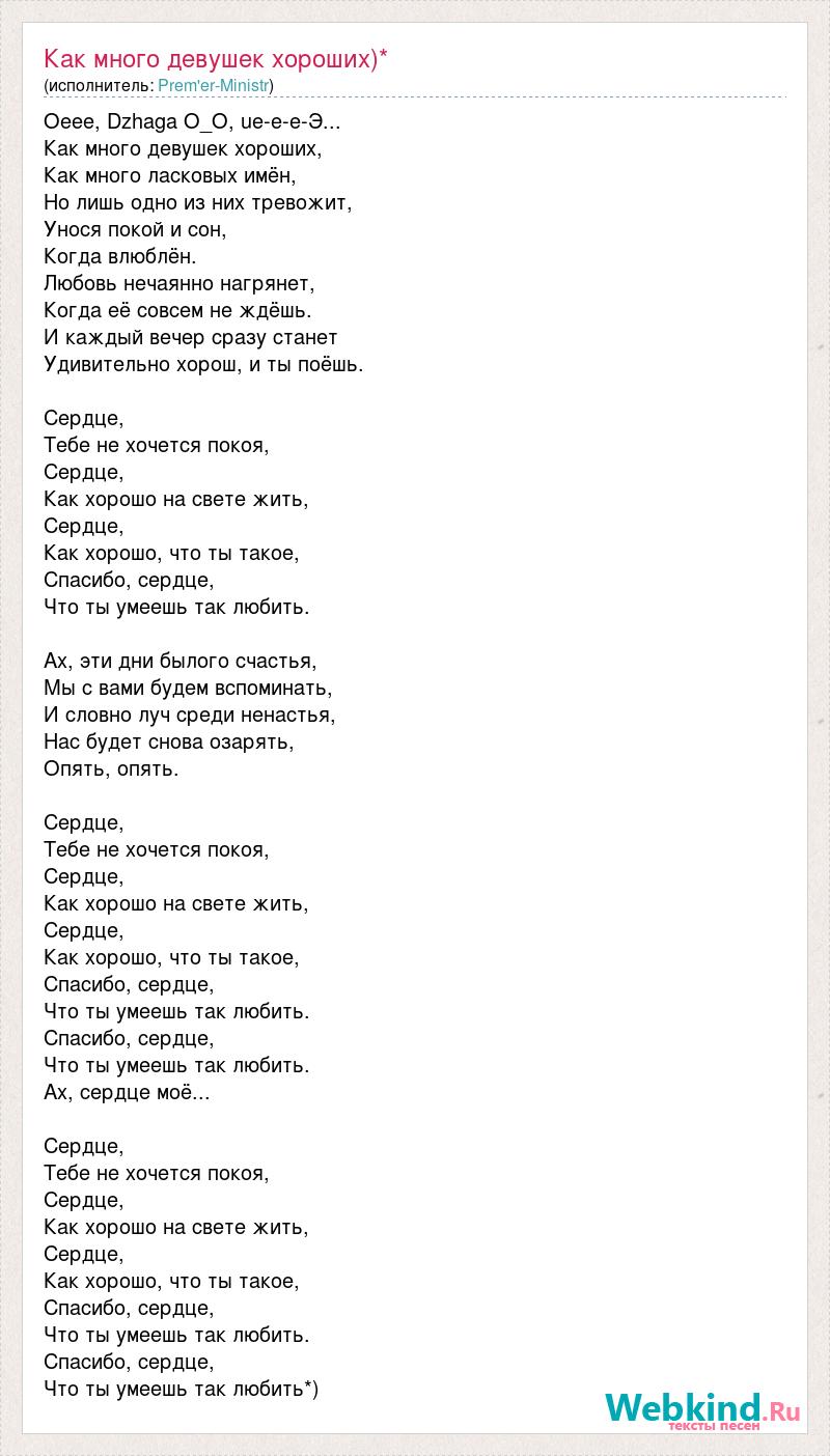 Оеее, Dzhaga О_О, ue-e-e-Э... Как много девушек хороших, Как много ласковых имён, Но лишь одно из них тревожит, Унося покой и сон, Когда влюблён. Любовь нечаянно нагрянет, Когда её совсем не ждёшь. И каждый вечер сразу станет Удивительно хорош, и ты поёшь. Сердце, Тебе не хочется покоя, Сердце, Как хорошо на свете жить, Сердце, Как хорошо, что ты такое, Спасибо, сердце, Что ты умеешь так любить. Ах, эти дни былого счастья, Мы с вами будем вспоминать, И словно луч среди ненастья, Нас будет снова озарять, Опять, опять. Сердце, Тебе не хочется покоя, Сердце, Как хорошо на свете жить, Сердце, Как хорошо, что ты такое, Спасибо, сердце, Что ты умеешь так любить. Спасибо, сердце, Что ты умеешь так любить. Ах, сердце моё... Сердце, Тебе не хочется покоя, Сердце, Как хорошо на свете жить, Сердце, Как хорошо, что ты такое, Спасибо, сердце, Что ты умеешь так любить. Спасибо, сердце, Что ты умеешь так любить*)