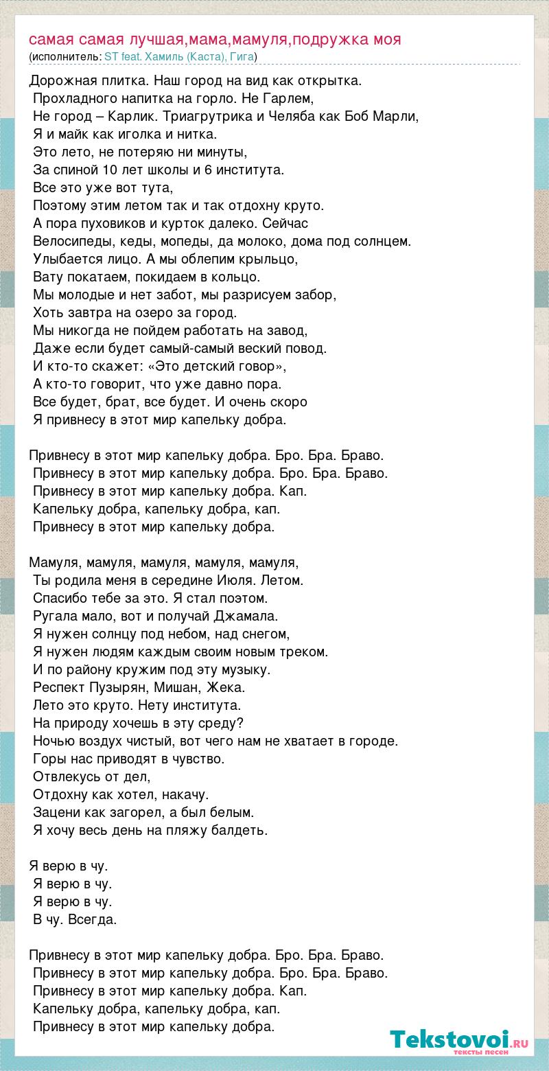 Дорожная плитка. Наш город на вид как открытка. Прохладного напитка на горло. Не Гарлем, Не город – Карлик. Триагрутрика и Челяба как Боб Марли, Я и майк как иголка и нитка. Это лето, не потеряю ни минуты, За спиной 10 лет школы и 6 института. Все это уже вот тута, Поэтому этим летом так и так отдохну круто. А пора пуховиков и курток далеко. Сейчас Велосипеды, кеды, мопеды, да молоко, дома под солнцем. Улыбается лицо. А мы облепим крыльцо, Вату покатаем, покидаем в кольцо. Мы молодые и нет забот, мы разрисуем забор, Хоть завтра на озеро за город. Мы никогда не пойдем работать на завод, Даже если будет самый-самый веский повод. И кто-то скажет: «Это детский говор», А кто-то говорит, что уже давно пора. Все будет, брат, все будет. И очень скоро Я привнесу в этот мир капельку добра. Привнесу в этот мир капельку добра. Бро. Бра. Браво. Привнесу в этот мир капельку добра. Бро. Бра. Браво. Привнесу в этот мир капельку добра. Кап. Капельку добра, капельку добра, кап. Привнесу в этот мир капельку добра. Мамуля, мамуля, мамуля, мамуля, мамуля, Ты родила меня в середине Июля. Летом. Спасибо тебе за это. Я стал поэтом. Ругала мало, вот и получай Джамала. Я нужен солнцу под небом, над снегом, Я нужен людям каждым своим новым треком. И по району кружим под эту музыку. Респект Пузырян, Мишан, Жека. Лето это круто. Нету института. На природу хочешь в эту среду? Ночью воздух чистый, вот чего нам не хватает в городе. Горы нас приводят в чувство. Отвлекусь от дел, Отдохну как хотел, накачу. Зацени как загорел, а был белым. Я хочу весь день на пляжу балдеть. Я верю в чу. Я верю в чу. Я верю в чу. В чу. Всегда. Привнесу в этот мир капельку добра. Бро. Бра. Браво. Привнесу в этот мир капельку добра. Бро. Бра. Браво. Привнесу в этот мир капельку добра. Кап. Капельку добра, капельку добра, кап. Привнесу в этот мир капельку добра.