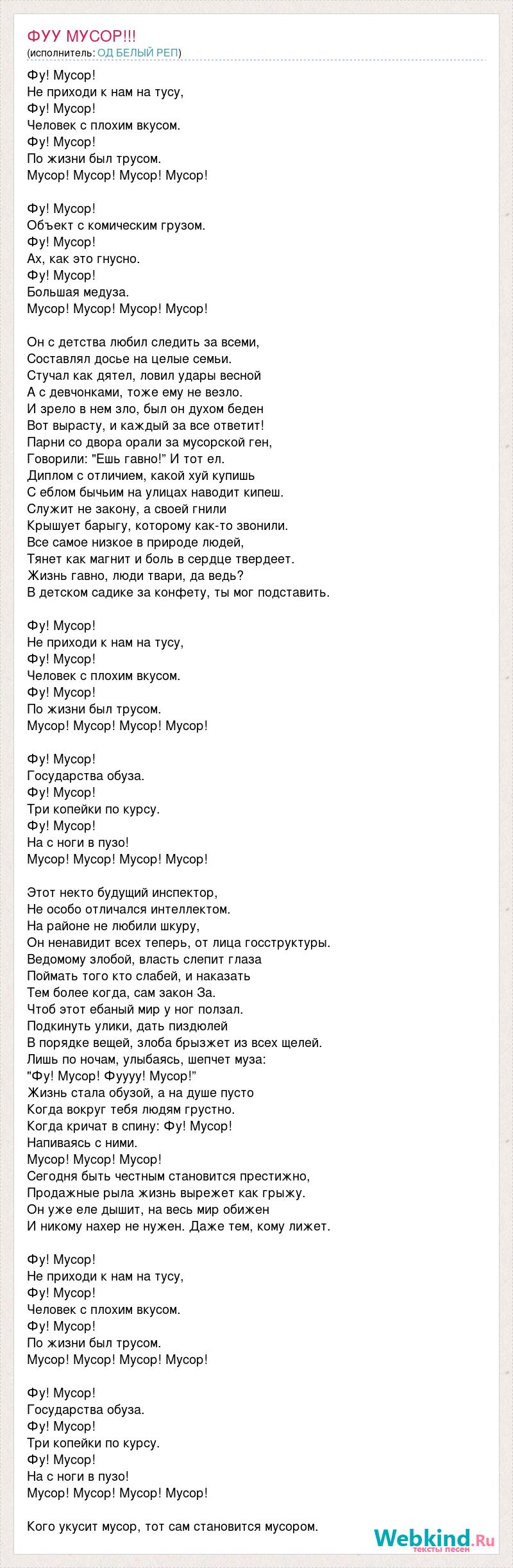 Фу! Мусор! Не приходи к нам на тусу, Фу! Мусор! Человек с плохим вкусом. Фу! Мусор! По жизни был трусом. Мусор! Мусор! Мусор! Мусор! Фу! Мусор! Объект с комическим грузом. Фу! Мусор! Ах, как это гнусно. Фу! Мусор! Большая медуза. Мусор! Мусор! Мусор! Мусор! Он с детства любил следить за всеми, Составлял досье на целые семьи. Стучал как дятел, ловил удары весной А с девчонками, тоже ему не везло. И зрело в нем зло, был он духом беден Вот вырасту, и каждый за все ответит! Парни со двора орали за мусорской ген, Говорили: "Ешь гавно!” И тот ел. Диплом с отличием, какой хуй купишь С еблом бычьим на улицах наводит кипеш. Служит не закону, а своей гнили Крышует барыгу, которому как-то звонили. Все самое низкое в природе людей, Тянет как магнит и боль в сердце твердеет. Жизнь гавно, люди твари, да ведь? В детском садике за конфету, ты мог подставить. Фу! Мусор! Не приходи к нам на тусу, Фу! Мусор! Человек с плохим вкусом. Фу! Мусор! По жизни был трусом. Мусор! Мусор! Мусор! Мусор! Фу! Мусор! Государства обуза. Фу! Мусор! Три копейки по курсу. Фу! Мусор! На с ноги в пузо! Мусор! Мусор! Мусор! Мусор! Этот некто будущий инспектор, Не особо отличался интеллектом. На районе не любили шкуру, Он ненавидит всех теперь, от лица госструктуры. Ведомому злобой, власть слепит глаза Поймать того кто слабей, и наказать Тем более когда, сам закон За. Чтоб этот ебаный мир у ног ползал. Подкинуть улики, дать пиздюлей В порядке вещей, злоба брызжет из всех щелей. Лишь по ночам, улыбаясь, шепчет муза: "Фу! Мусор! Фуууу! Мусор!” Жизнь стала обузой, а на душе пусто Когда вокруг тебя людям грустно. Когда кричат в спину: Фу! Мусор! Напиваясь с ними. Мусор! Мусор! Мусор! Сегодня быть честным становится престижно, Продажные рыла жизнь вырежет как грыжу. Он уже еле дышит, на весь мир обижен И никому нахер не нужен. Даже тем, кому лижет. Фу! Мусор! Не приходи к нам на тусу, Фу! Мусор! Человек с плохим вкусом. Фу! Мусор! По жизни был трусом. Мусор! Мусор! Мусор! Мусор! Фу! Мусор! Государства обуза. Фу! Мусор! Три копейки по курсу. Фу! Мусор! На с ноги в пузо! Мусор! Мусор! Мусор! Мусор! Кого укусит мусор, тот сам становится мусором.