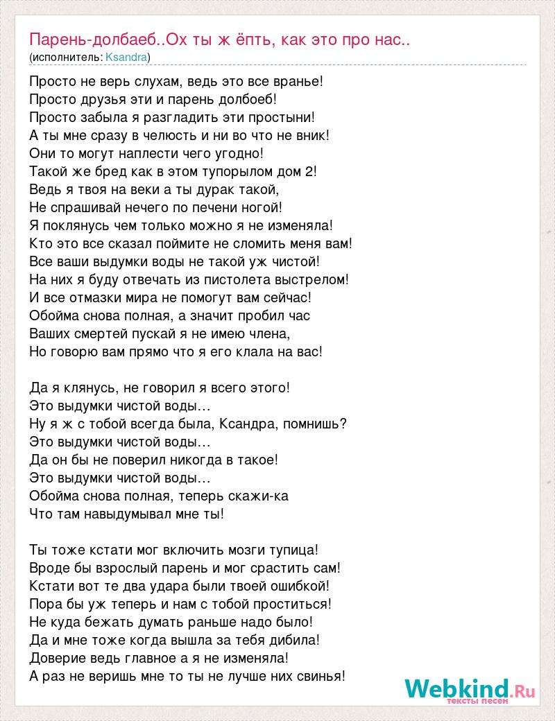 Просто не верь слухам, ведь это все вранье! Просто друзья эти и парень долбоеб! Просто забыла я разгладить эти простыни! А ты мне сразу в челюсть и ни во что не вник! Они то могут наплести чего угодно! Такой же бред как в этом тупорылом дом 2! Ведь я твоя на веки а ты дурак такой, Не спрашивай нечего по печени ногой! Я поклянусь чем только можно я не изменяла! Кто это все сказал поймите не сломить меня вам! Все ваши выдумки воды не такой уж чистой! На них я буду отвечать из пистолета выстрелом! И все отмазки мира не помогут вам сейчас! Обойма снова полная, а значит пробил час Ваших смертей пускай я не имею члена, Но говорю вам прямо что я его клала на вас! Да я клянусь, не говорил я всего этого! Это выдумки чистой воды… Ну я ж с тобой всегда была, Ксандра, помнишь? Это выдумки чистой воды… Да он бы не поверил никогда в такое! Это выдумки чистой воды… Обойма снова полная, теперь скажи-ка Что там навыдумывал мне ты! Ты тоже кстати мог включить мозги тупица! Вроде бы взрослый парень и мог срастить сам! Кстати вот те два удара были твоей ошибкой! Пора бы уж теперь и нам с тобой проститься! Не куда бежать думать раньше надо было! Да и мне тоже когда вышла за тебя дибила! Доверие ведь главное а я не изменяла! А раз не веришь мне то ты не лучше них свинья!