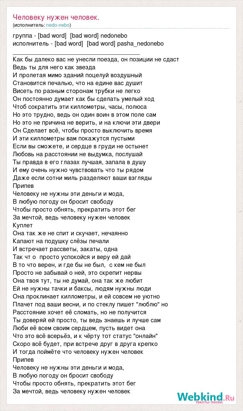 группа - [bad word] [bad word] nedonebo исполнитель - [bad word] [bad word] pasha_nedonebo ______________________________________ Как бы далеко вас не унесли поезда, он позиции не сдаст Ведь ты для него как звезда И пролетая мимо зданий поцелуй воздушный Становится печалью, что на едине вас душит Висеть по разным сторонам трубки не легко Он постоянно думает как бы сделать умелый ход Чтоб сократить эти киллометры, часы, полюса Но это трудно, ведь он один воин в этом поле сам Но это не причина не верить, и на ключи эти двери Он Сделает всё, чтобы просто выключить время И эти киллометры вам покажутся пустыми Если вы сможете, и сердце в груди не остынет Любовь на расстоянии не выдумка, послушай Ты правда в его глазах лучшая, запала в душу И ему очень нужно чувствовать что ты рядом Даже если сотни миль разделяют ваши взгляды Припев Человеку не нужны эти деньги и мода, В любую погоду он бросит свободу Чтобы просто обнять, прекратить этот бег За мечтой, ведь человеку нужен человек Куплет Она так же не спит и скучает, нечаянно Капают на подушку слёзы печали И встречает рассветы, закаты, одна Так чт о просто успокойся и веру ей дай В то что верен, и где бы не был, с кем не был Просто не забывай о ней, это скрепит нервы Она твоя тут, ты не думай, она так же любит Ей не нужны тачки и баксы, людям нужны люди Она проклинает киллометры, и ей совсем не уютно Плачет под ваши весни, и по стеклу пишет "люблю" но Расстояние хочет её сломать, но не получится Ты доверяй ей просто, ты ведь знаешь и лучше сам Люби её всем своим сердцем, пусть видет она Что это всё всерьёз, и к чёрту тот статус "онлайн" Скоро всё будет, при встрече друг в друга крепко И тогда поймёте что человеку нужен человек Припев Человеку не нужны эти деньги и мода, В любую погоду он бросит свободу Чтобы просто обнять, прекратить этот бег За мечтой, ведь человеку нужен человек
