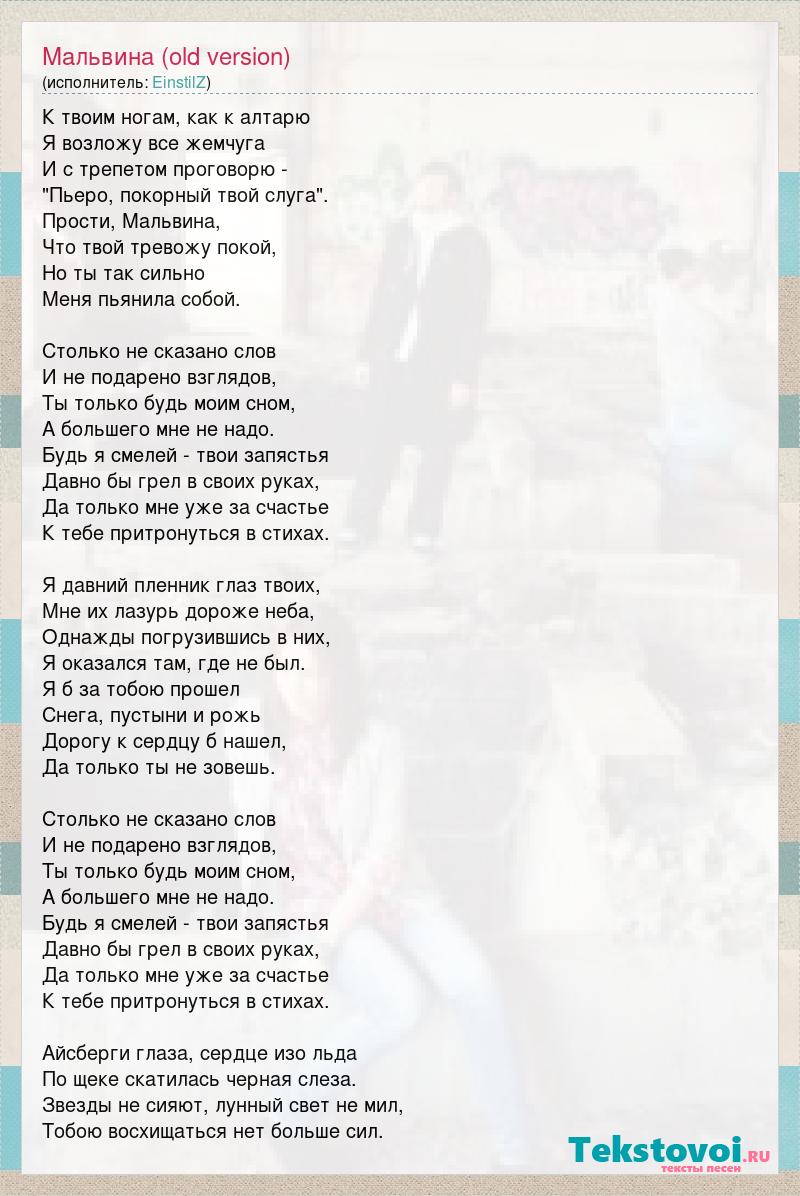 К твоим ногам, как к алтарю Я возложу все жемчуга И с трепетом проговорю - "Пьеро, покорный твой слуга". Прости, Мальвина, Что твой тревожу покой, Но ты так сильно Меня пьянила собой. Столько не сказано слов И не подарено взглядов, Ты только будь моим сном, А большего мне не надо. Будь я смелей - твои запястья Давно бы грел в своих руках, Да только мне уже за счастье К тебе притронуться в стихах. Я давний пленник глаз твоих, Мне их лазурь дороже неба, Однажды погрузившись в них, Я оказался там, где не был. Я б за тобою прошел Снега, пустыни и рожь Дорогу к сердцу б нашел, Да только ты не зовешь. Столько не сказано слов И не подарено взглядов, Ты только будь моим сном, А большего мне не надо. Будь я смелей - твои запястья Давно бы грел в своих руках, Да только мне уже за счастье К тебе притронуться в стихах. Айсберги глаза, сердце изо льда По щеке скатилась черная слеза. Звезды не сияют, лунный свет не мил, Тобою восхищаться нет больше сил.