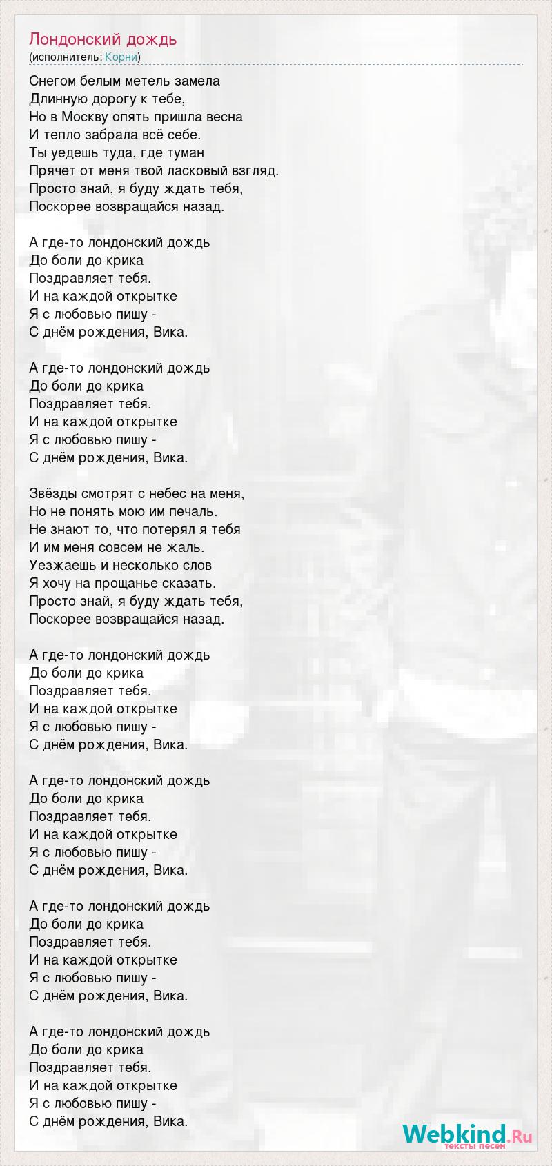Снегом белым метель замела Длинную дорогу к тебе, Но в Москву опять пришла весна И тепло забрала всё себе. Ты уедешь туда, где туман Прячет от меня твой ласковый взгляд. Просто знай, я буду ждать тебя, Поскорее возвращайся назад. А где-то лондонский дождь До боли до крика Поздравляет тебя. И на каждой открытке Я с любовью пишу - С днём рождения, Вика. А где-то лондонский дождь До боли до крика Поздравляет тебя. И на каждой открытке Я с любовью пишу - С днём рождения, Вика. Звёзды смотрят с небес на меня, Но не понять мою им печаль. Не знают то, что потерял я тебя И им меня совсем не жаль. Уезжаешь и несколько слов Я хочу на прощанье сказать. Просто знай, я буду ждать тебя, Поскорее возвращайся назад. А где-то лондонский дождь До боли до крика Поздравляет тебя. И на каждой открытке Я с любовью пишу - С днём рождения, Вика. А где-то лондонский дождь До боли до крика Поздравляет тебя. И на каждой открытке Я с любовью пишу - С днём рождения, Вика. А где-то лондонский дождь До боли до крика Поздравляет тебя. И на каждой открытке Я с любовью пишу - С днём рождения, Вика. А где-то лондонский дождь До боли до крика Поздравляет тебя. И на каждой открытке Я с любовью пишу - С днём рождения, Вика.