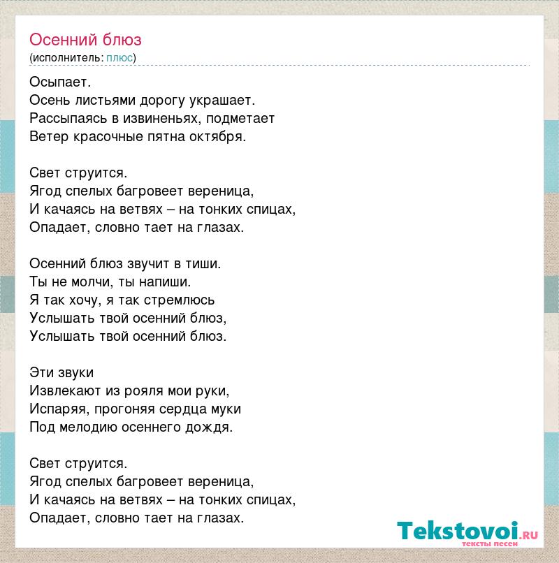 Осыпает. Осень листьями дорогу украшает. Рассыпаясь в извиненьях, подметает Ветер красочные пятна октября. Свет струится. Ягод спелых багровеет вереница, И качаясь на ветвях – на тонких спицах, Опадает, словно тает на глазах. Осенний блюз звучит в тиши. Ты не молчи, ты напиши. Я так хочу, я так стремлюсь Услышать твой осенний блюз, Услышать твой осенний блюз. Эти звуки Извлекают из рояля мои руки, Испаряя, прогоняя сердца муки Под мелодию осеннего дождя. Свет струится. Ягод спелых багровеет вереница, И качаясь на ветвях – на тонких спицах, Опадает, словно тает на глазах.
