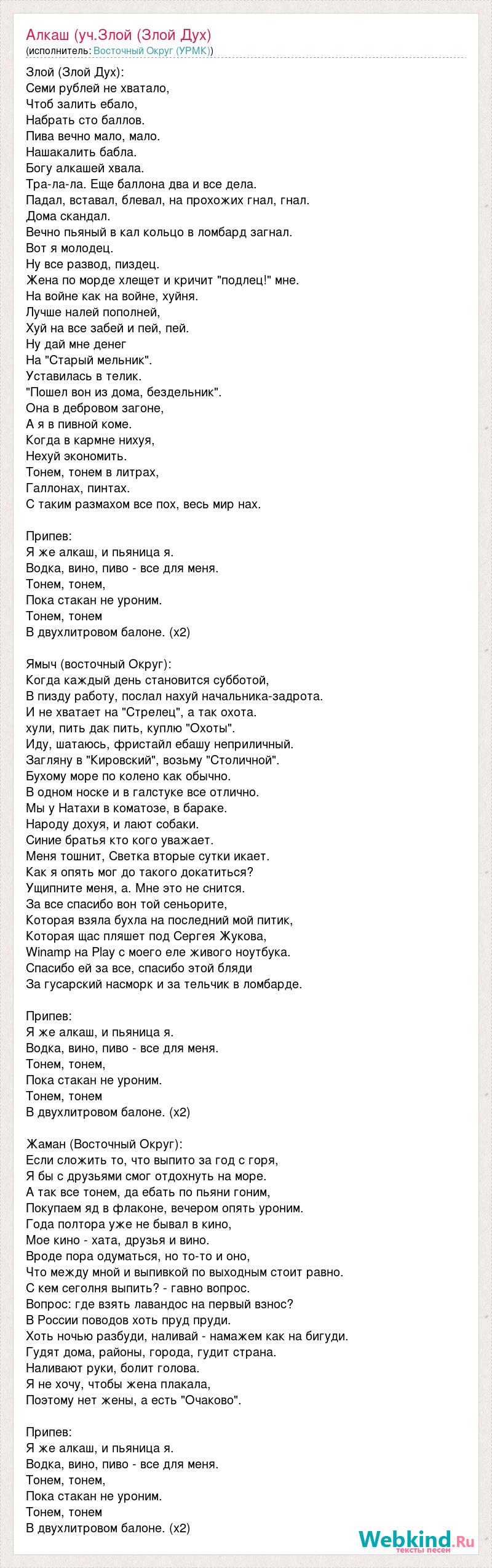 Злой (Злой Дух): Семи рублей не хватало, Чтоб залить ебало, Набрать сто баллов. Пива вечно мало, мало. Нашакалить бабла. Богу алкашей хвала. Тра-ла-ла. Еще баллона два и все дела. Падал, вставал, блевал, на прохожих гнал, гнал. Дома скандал. Вечно пьяный в кал кольцо в ломбард загнал. Вот я молодец. Ну все развод, пиздец. Жена по морде хлещет и кричит "подлец!" мне. На войне как на войне, хуйня. Лучше налей пополней, Хуй на все забей и пей, пей. Ну дай мне денег На "Старый мельник". Уставилась в телик. "Пошел вон из дома, бездельник". Она в дебровом загоне, А я в пивной коме. Когда в кармне нихуя, Нехуй экономить. Тонем, тонем в литрах, Галлонах, пинтах. С таким размахом все пох, весь мир нах. Припев: Я же алкаш, и пьяница я. Водка, вино, пиво - все для меня. Тонем, тонем, Пока стакан не уроним. Тонем, тонем В двухлитровом балоне. (x2) Ямыч (восточный Округ): Когда каждый день становится субботой, В пизду работу, послал нахуй начальника-задрота. И не хватает на "Стрелец", а так охота. хули, пить дак пить, куплю "Охоты". Иду, шатаюсь, фристайл ебашу неприличный. Загляну в "Кировский", возьму "Столичной". Бухому море по колено как обычно. В одном носке и в галстуке все отлично. Мы у Натахи в коматозе, в бараке. Народу дохуя, и лают собаки. Синие братья кто кого уважает. Меня тошнит, Светка вторые сутки икает. Как я опять мог до такого докатиться? Ущипните меня, а. Мне это не снится. За все спасибо вон той сеньорите, Которая взяла бухла на последний мой питик, Которая щас пляшет под Сергея Жукова, Winamp на Play с моего еле живого ноутбука. Спасибо ей за все, спасибо этой бляди За гусарский насморк и за тельчик в ломбарде. Припев: Я же алкаш, и пьяница я. Водка, вино, пиво - все для меня. Тонем, тонем, Пока стакан не уроним. Тонем, тонем В двухлитровом балоне. (x2) Жаман (Восточный Округ): Если сложить то, что выпито за год с горя, Я бы с друзьями смог отдохнуть на море. А так все тонем, да ебать по пьяни гоним, Покупаем яд в флаконе, вечером опять уроним. Года полтора уже не бывал в кино, Мое кино - хата, друзья и вино. Вроде пора одуматься, но то-то и оно, Что между мной и выпивкой по выходным стоит равно. С кем сеголня выпить? - гавно вопрос. Вопрос: где взять лавандос на первый взнос? В России поводов хоть пруд пруди. Хоть ночью разбуди, наливай - намажем как на бигуди. Гудят дома, районы, города, гудит страна. Наливают руки, болит голова. Я не хочу, чтобы жена плакала, Поэтому нет жены, а есть "Очаково". Припев: Я же алкаш, и пьяница я. Водка, вино, пиво - все для меня. Тонем, тонем, Пока стакан не уроним. Тонем, тонем В двухлитровом балоне. (x2)