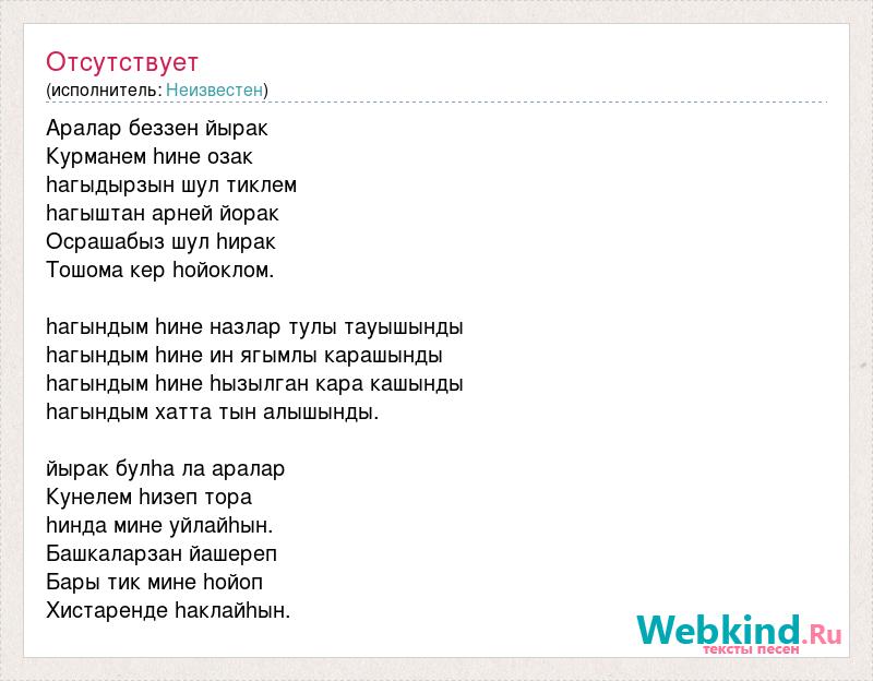 Аралар беззен йырак Курманем hине озак hагыдырзын шул тиклем hагыштан арней йорак Осрашабыз шул hирак Тошома кер hойоклом. hагындым hине назлар тулы тауышынды hагындым hине ин ягымлы карашынды hагындым hине hызылган кара кашынды hагындым хатта тын алышынды. йырак булhа ла аралар Кунелем hизеп тора hинда мине уйлайhын. Башкаларзан йашереп Бары тик мине hойоп Хистаренде hаклайhын.