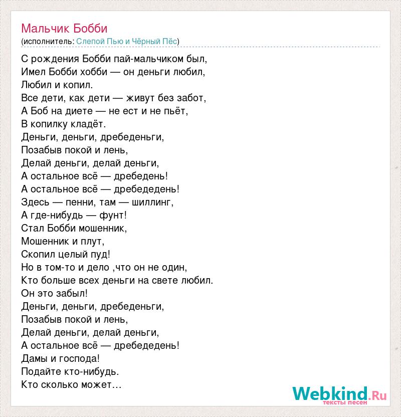 С рождения Бобби пай-мальчиком был, Имел Бобби хобби — он деньги любил, Любил и копил. Все дети, как дети — живут без забот, А Боб на диете — не ест и не пьёт, В копилку кладёт. Деньги, деньги, дребеденьги, Позабыв покой и лень, Делай деньги, делай деньги, А остальное всё — дребедень! А остальное всё — дребедедень! Здесь — пенни, там — шиллинг, А где-нибудь — фунт! Стал Бобби мошенник, Мошенник и плут, Скопил целый пуд! Но в том-то и дело ,что он не один, Кто больше всех деньги на свете любил. Он это забыл! Деньги, деньги, дребеденьги, Позабыв покой и лень, Делай деньги, делай деньги, А остальное всё — дребедедень! Дамы и господа! Подайте кто-нибудь. Кто сколько может…