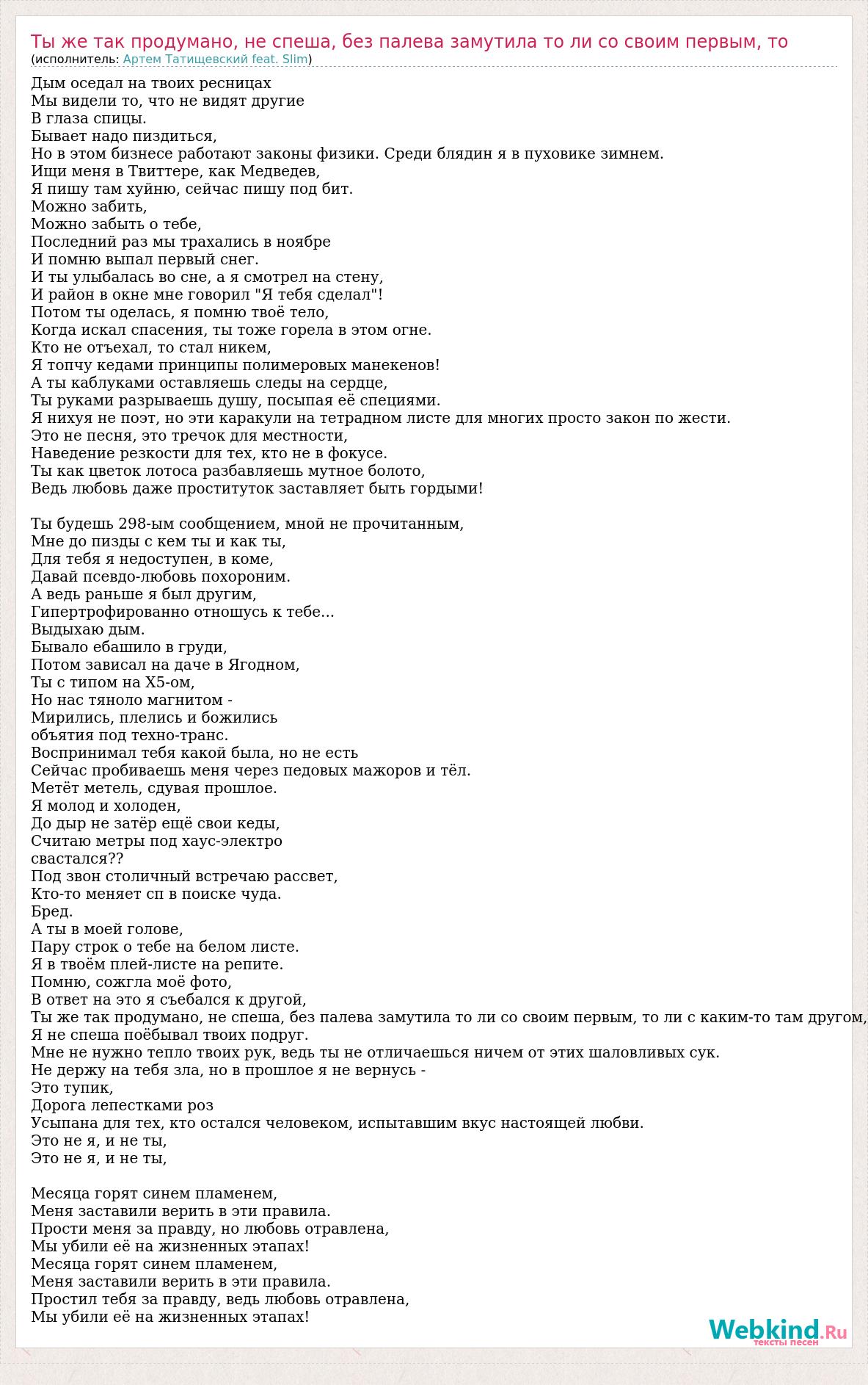 Главная→Исполнители→Артем Татищевский feat. Slim→Ты же так продумано, не спеша, без палева замутила то ли со своим первым,