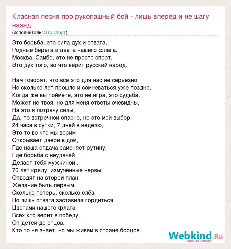 Это борьба, это сила дух и отвага, Родные берега и цвета нашего флага. Москва, Самбо, это не просто спорт, Это дух того, во что верит русский народ. Нам говорят, что все это для нас не серьезно Но сколько лет прошло и сомневаться уже поздно, Когда же вы поймете, это не игра, это судьба, Может не твоя, но для меня ответы очевидны, На это я потрачу силы, Да, по встречной опасно, но это мой выбор, 24 часа в сутки, 7 дней в неделю, Это то во что мы верим Открывает двери в дом, Где наша отдача заменяет рутину, Где борьба с неудачей Делает тебя мужчиной . 70 лет кряду, измученные нервы Отводят на второй план Желание быть первым. Сколько потерь, сколько слёз, Но лишь отвага заставила гордиться Цветами нашего флага Всех кто верит в победу, От детей до отцов. Кто то не знает, но мы живем в стране борцов