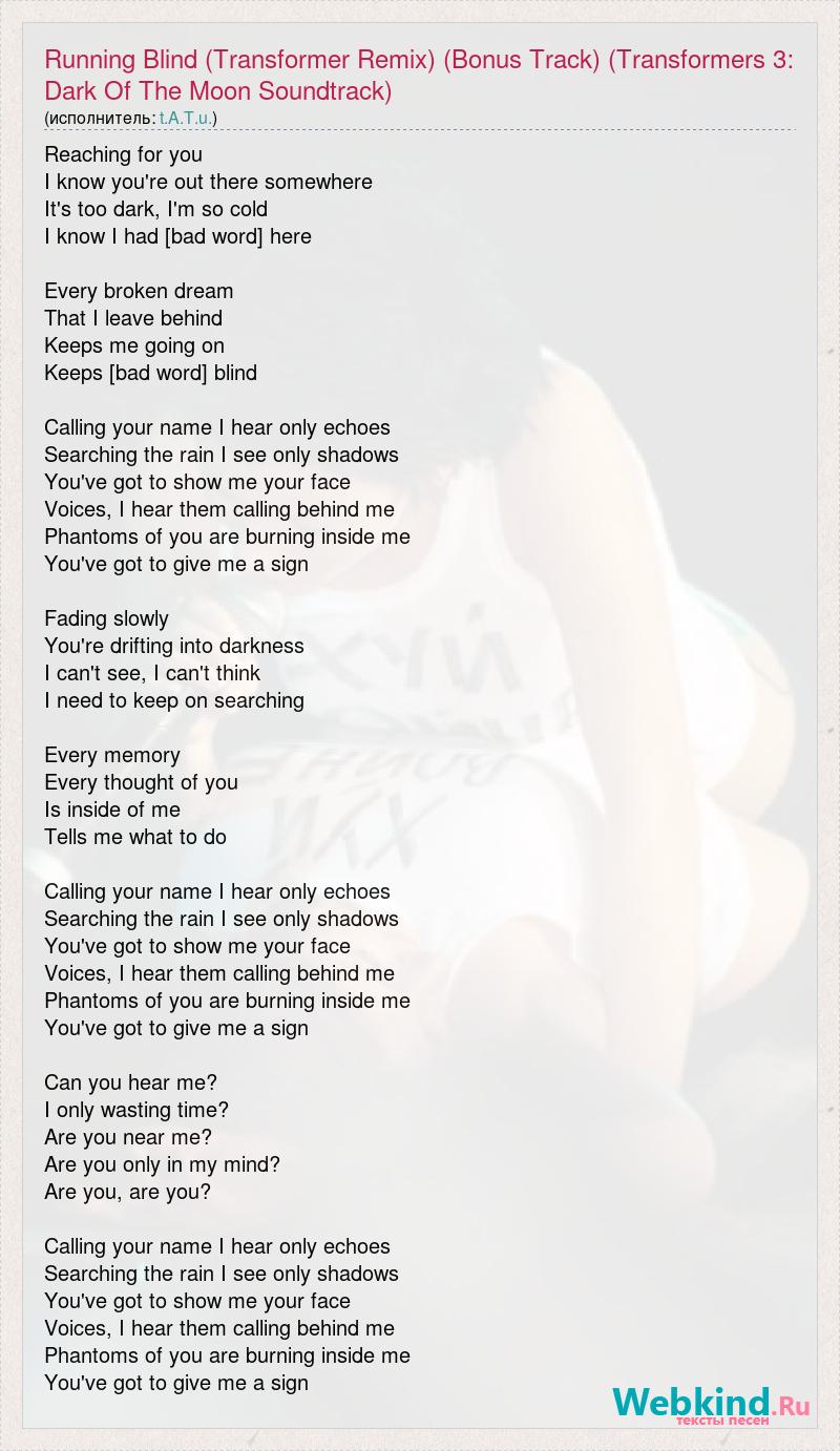 Главная→Исполнители→t.A.T.u.→Running Blind (Transformer Remix) (Bonus Track) (Transformers 3: Dark Of