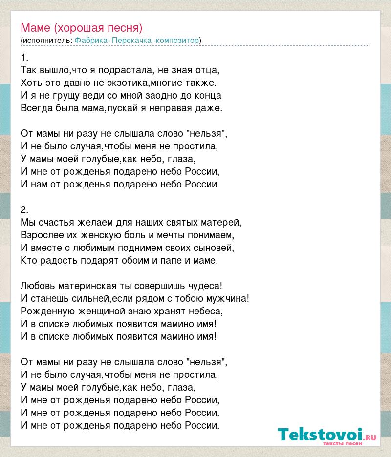 1. Так вышло,что я подрастала, не зная отца, Хоть это давно не экзотика,многие также. И я не грущу веди со мной заодно до конца Всегда была мама,пускай я неправая даже. От мамы ни разу не слышала слово "нельзя", И не было случая,чтобы меня не простила, У мамы моей голубые,как небо, глаза, И мне от рожденья подарено небо России, И нам от рожденья подарено небо России. 2. Мы счастья желаем для наших святых матерей, Взрослее их женскую боль и мечты понимаем, И вместе с любимым поднимем своих сыновей, Кто радость подарят обоим и папе и маме. Любовь материнская ты совершишь чудеса! И станешь сильней,если рядом с тобою мужчина! Рожденную женщиной знаю хранят небеса, И в списке любимых появится мамино имя! И в списке любимых появится мамино имя! От мамы ни разу не слышала слово "нельзя", И не было случая,чтобы меня не простила, У мамы моей голубые,как небо, глаза, И мне от рожденья подарено небо России, И мне от рожденья подарено небо России. И мне от рожденья подарено небо России.