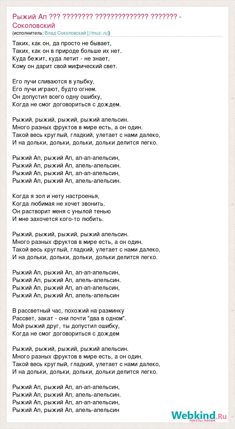 Таких, как он, да просто не бывает, Таких, как он в природе больше их нет. Куда бежит, куда летит - не знает, Кому он дарит свой мифический свет. Его лучи сливаются в улыбку, Его лучи играют, будто огнем. Он допустил всего одну ошибку, Когда не смог договориться с дождем. Рыжий, рыжий, рыжий, рыжий апельсин. Много разных фруктов в мире есть, а он один. Такой весь круглый, гладкий, улетает с нами далеко, И на дольки, дольки, дольки, дольки делится легко. Рыжий Ап, рыжий Ап, ап-ап-апельсин, Рыжий Ап, рыжий Ап, апель-апельсин. Рыжий Ап, рыжий Ап, ап-ап-апельсин, Рыжий Ап, рыжий Ап, апель-апельсин. Когда я зол и нету настроенья, Когда любимая не хочет звонить. Он растворит меня с унылой тенью И мне захочется кого-то любить. Рыжий, рыжий, рыжий, рыжий апельсин. Много разных фруктов в мире есть, а он один. Такой весь круглый, гладкий, улетает с нами далеко, И на дольки, дольки, дольки, дольки делится легко. Рыжий Ап, рыжий Ап, ап-ап-апельсин, Рыжий Ап, рыжий Ап, апель-апельсин. Рыжий Ап, рыжий Ап, ап-ап-апельсин, Рыжий Ап, рыжий Ап, апель-апельсин В рассветный час, похожий на разминку Рассвет, закат - они почти "два в одном". Мой рыжий друг, ты допустил ошибку, Когда не смог договориться с дождем Рыжий, рыжий, рыжий, рыжий апельсин. Много разных фруктов в мире есть, а он один. Такой весь круглый, гладкий, улетает с нами далеко, И на дольки, дольки, дольки, дольки делится легко. Рыжий Ап, рыжий Ап, ап-ап-апельсин, Рыжий Ап, рыжий Ап, апель-апельсин. Рыжий Ап, рыжий Ап, ап-ап-апельсин, Рыжий Ап, рыжий Ап, апель-апельсин